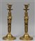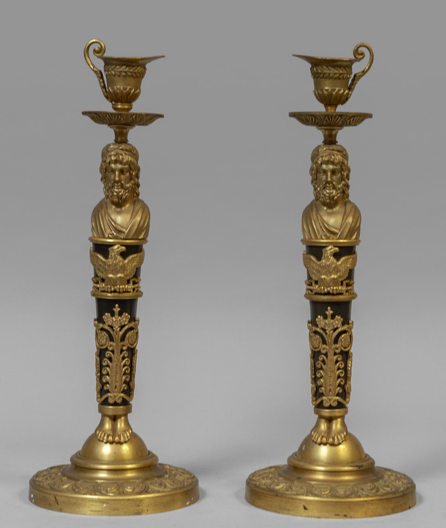 Coppia di grandi candelieri in bronzo dorato con profili classici che sorreggono un vaso portaluce sec.XIX