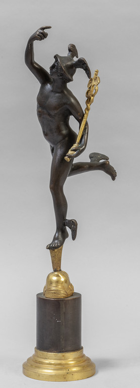 Mercurio scultura in bronzo a patina scura con elementi in bronzo dorato sec.XX