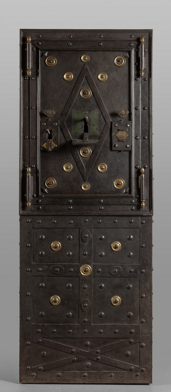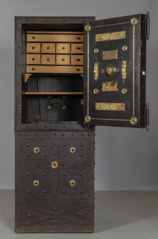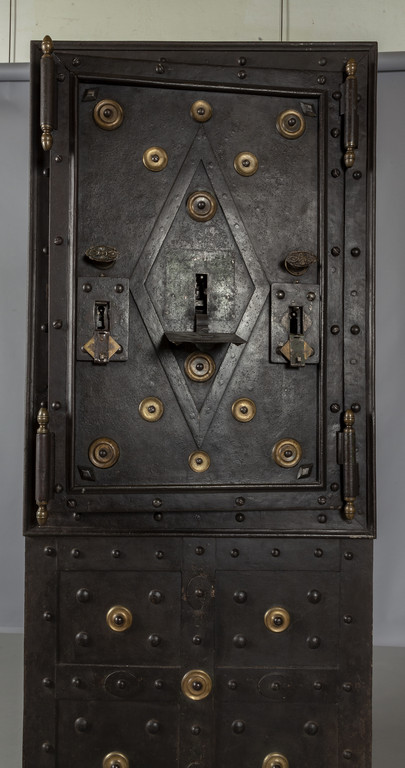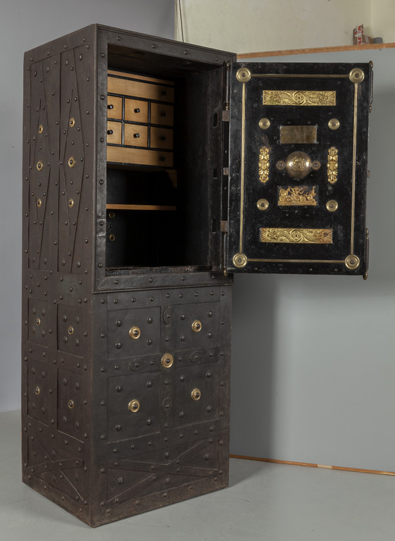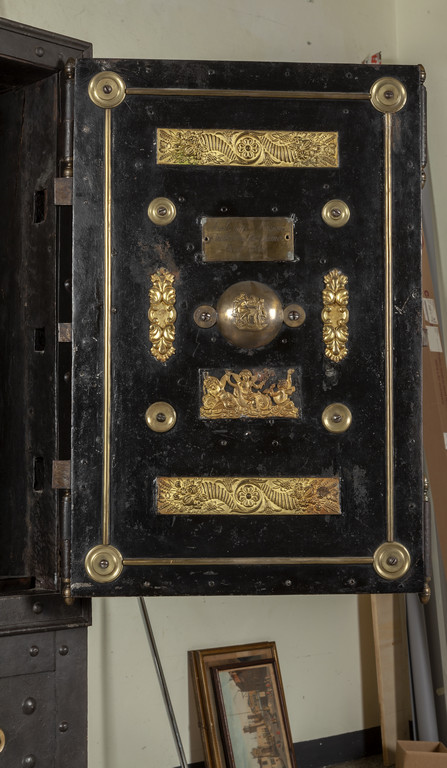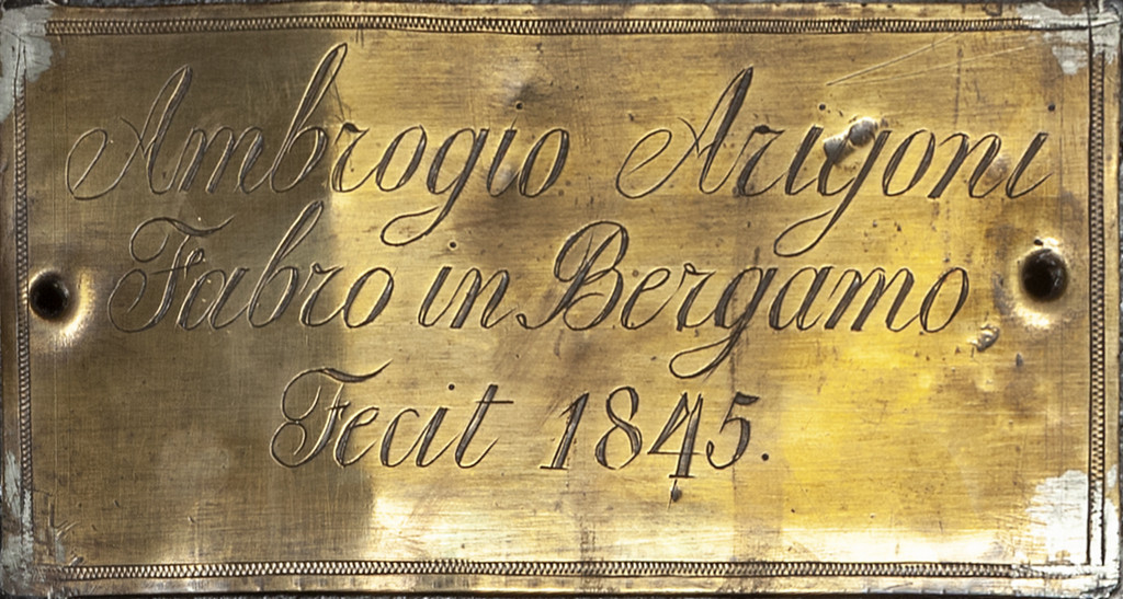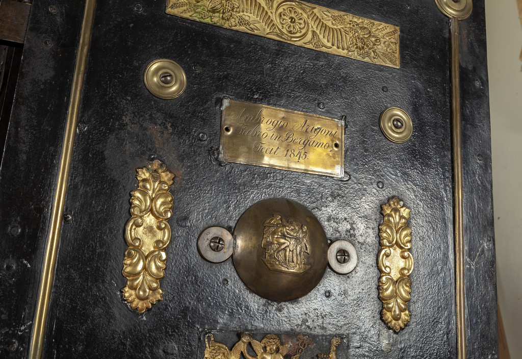 Antica cassaforte firmata e datata all'interno su placca in ottone recante la dicitura 'Ambrogio Arigoni 1845 fecit'.