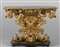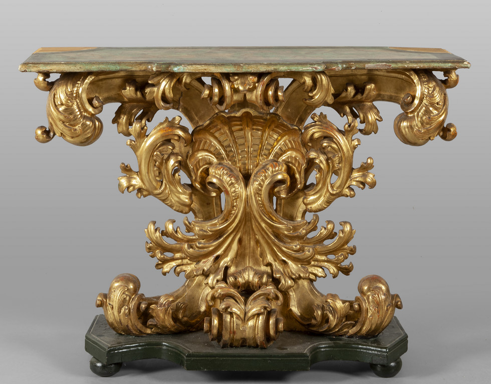 Console Luigi XIV in legno finemente intagliato e dorato piano in legno laccato verde Roma sec.XVIII