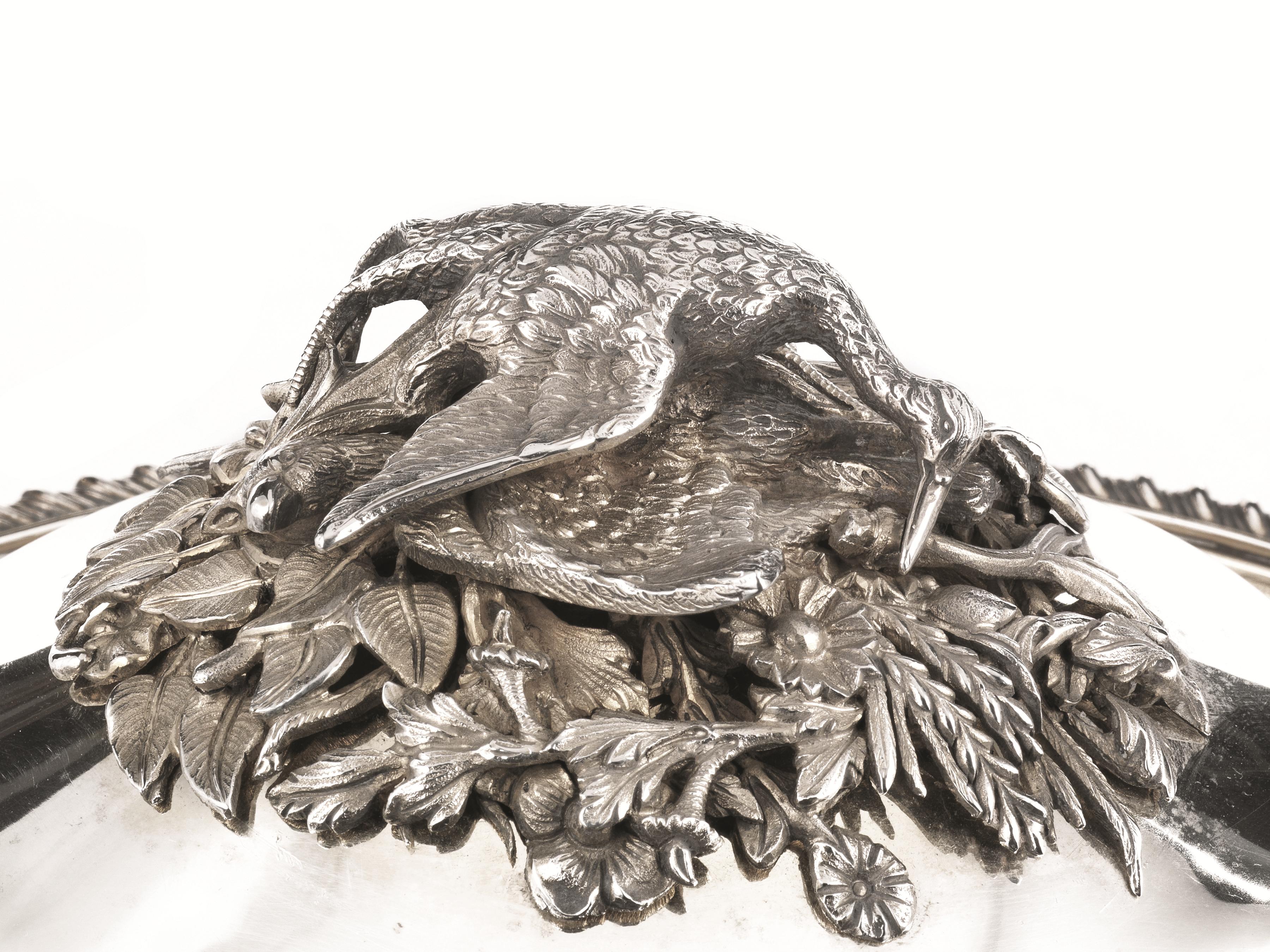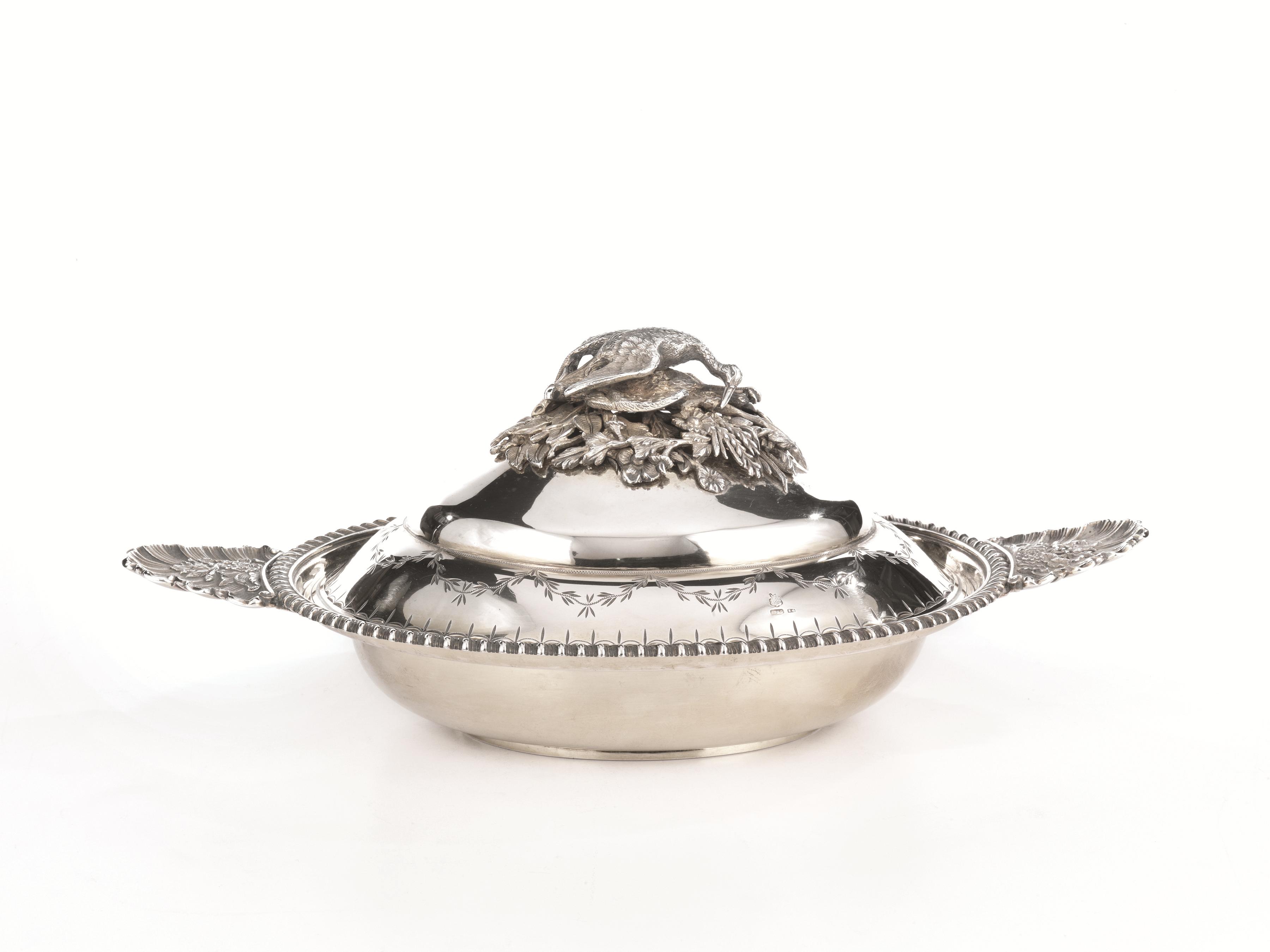 Legumiera, Mosca, 1796, in argento vermeille, presa del coperchio modellata a cacciagione e foglie, g 1530 ed altra legumiera in metallo argentato e dorato con presa del coperchio modellata a cacciagione (2)