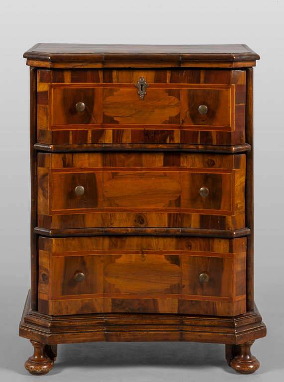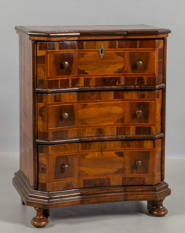 Mobiletto Luigi XIV movimentato sul fronte fianchi scantonati lastronato in legno santo Veneto sec.XVIII