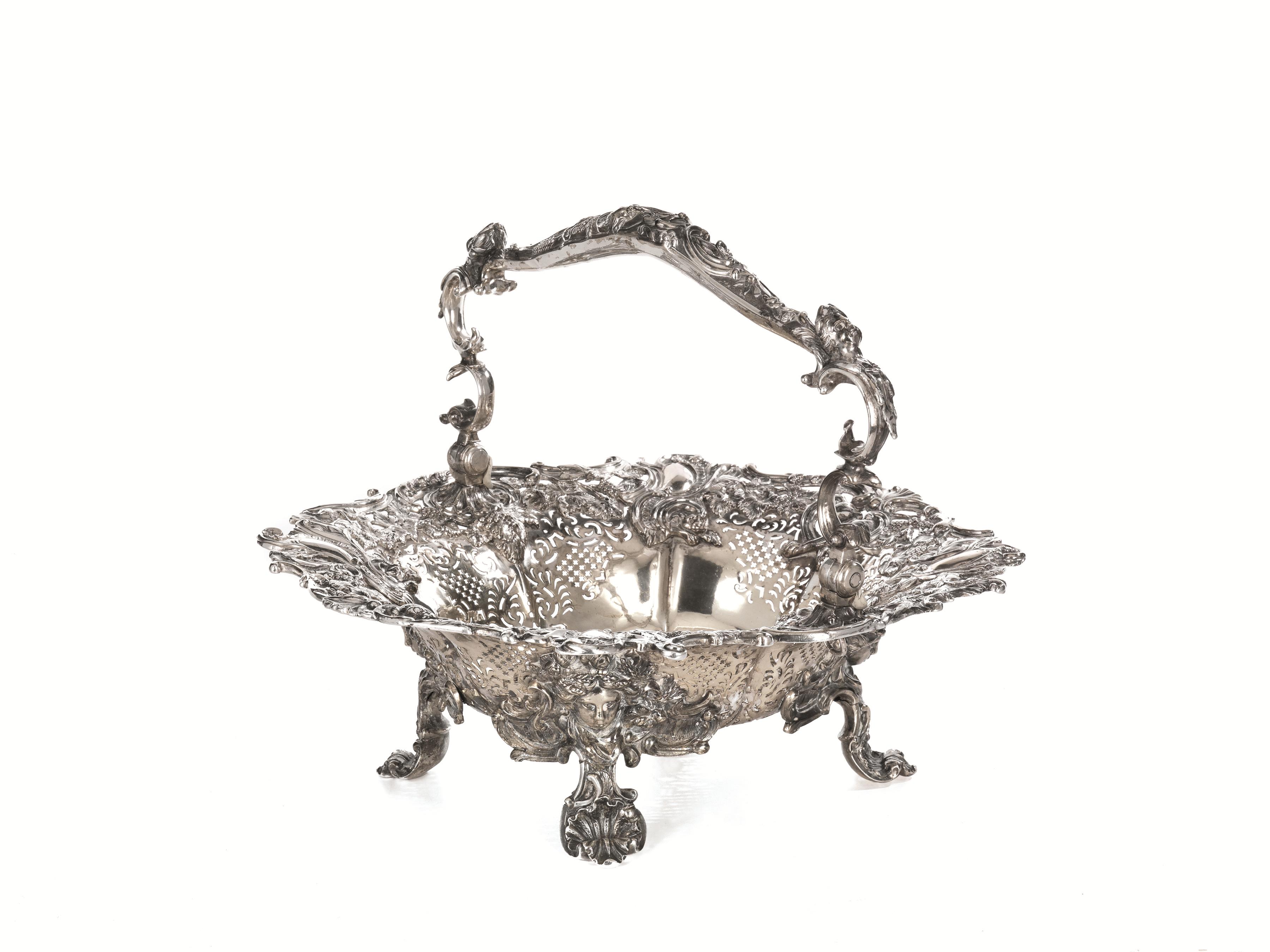Cestina, Londra, 1808, in argento traforato, ampia tesa lavorata a viticci ed animali, bordo e manico sagomati, cavetto con motto inciso, base a quattro piedini uniti al corpo da metope femminili, cm 36x33, g 3400, tesa di epoca posteriore