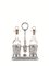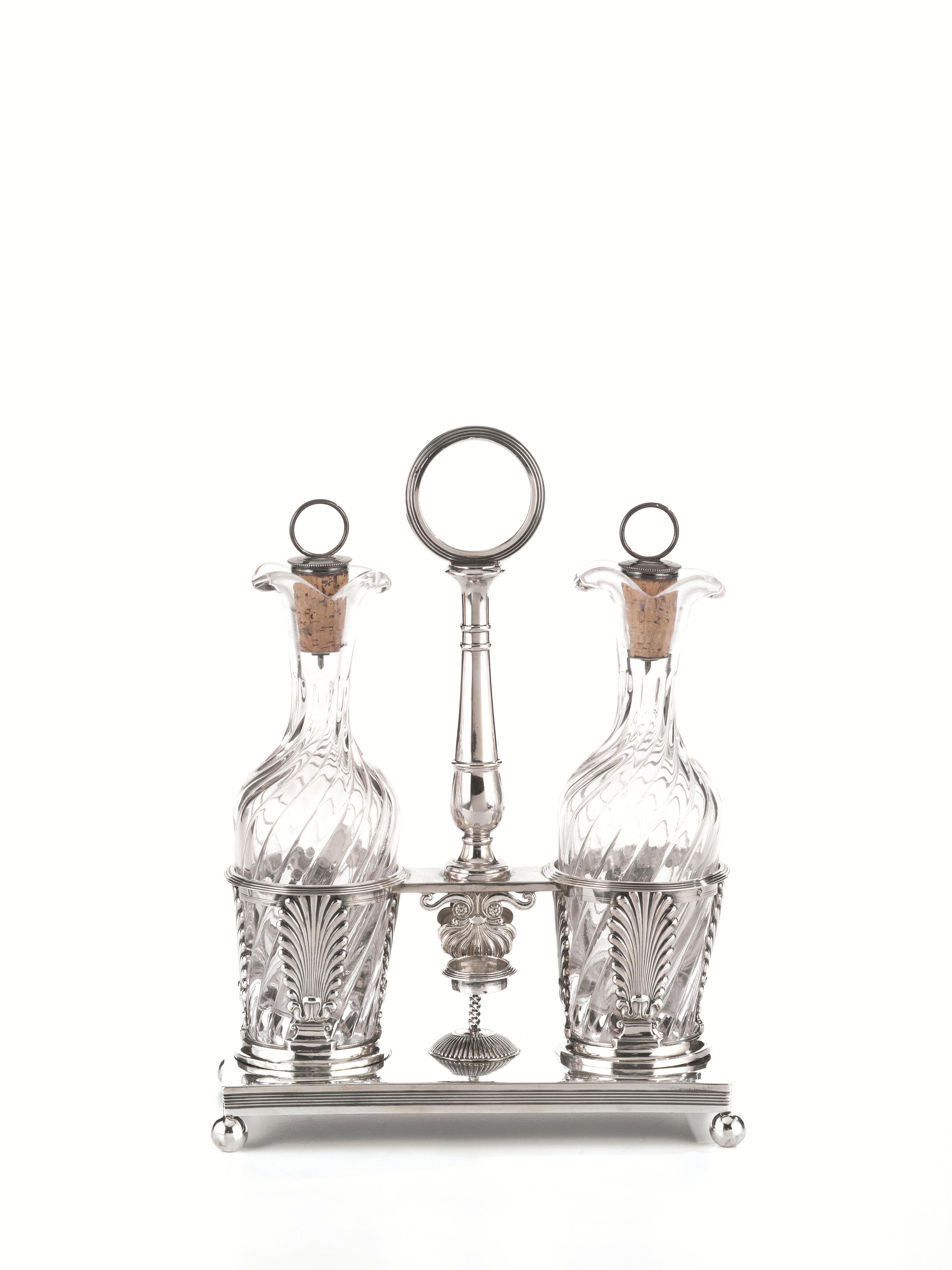 Oliera, Parigi, prima metà sec. XIX, facitore D.G. Garreau, in argento, base rettangolare a quattro piedini a sfera e portampolle sbalzate a palmette, fusto a balaustro con presa ad anello, completa di ampolle in vetro lavorato torchon, g 540