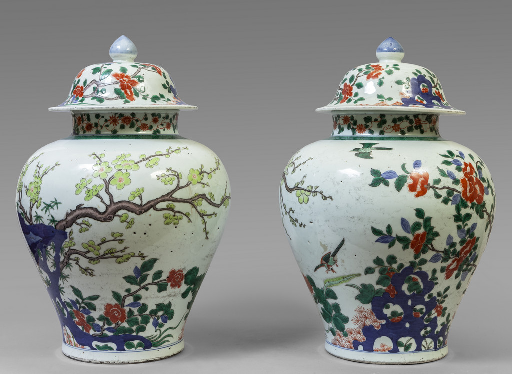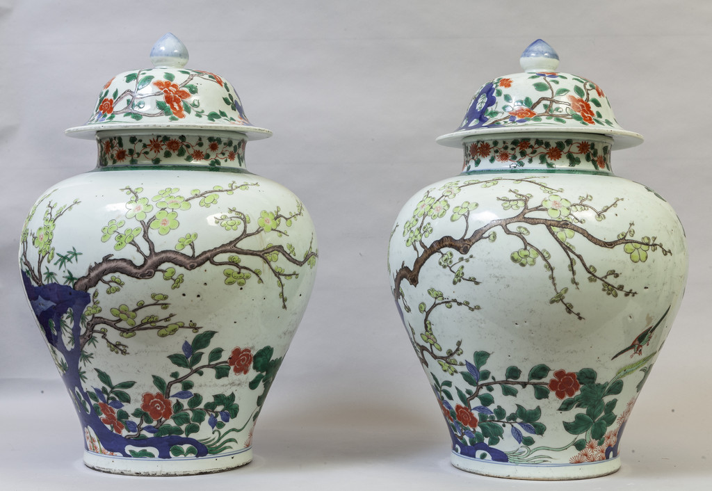 Coppia di potiches in porcellana decorate in policromia a fiori