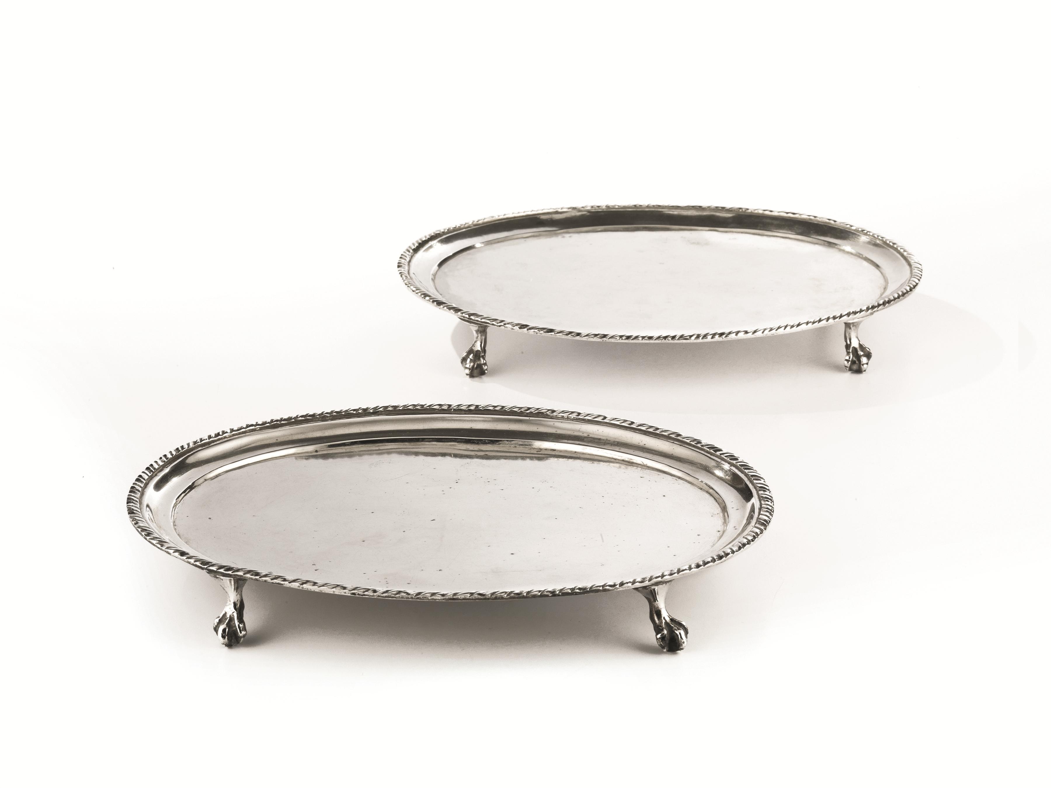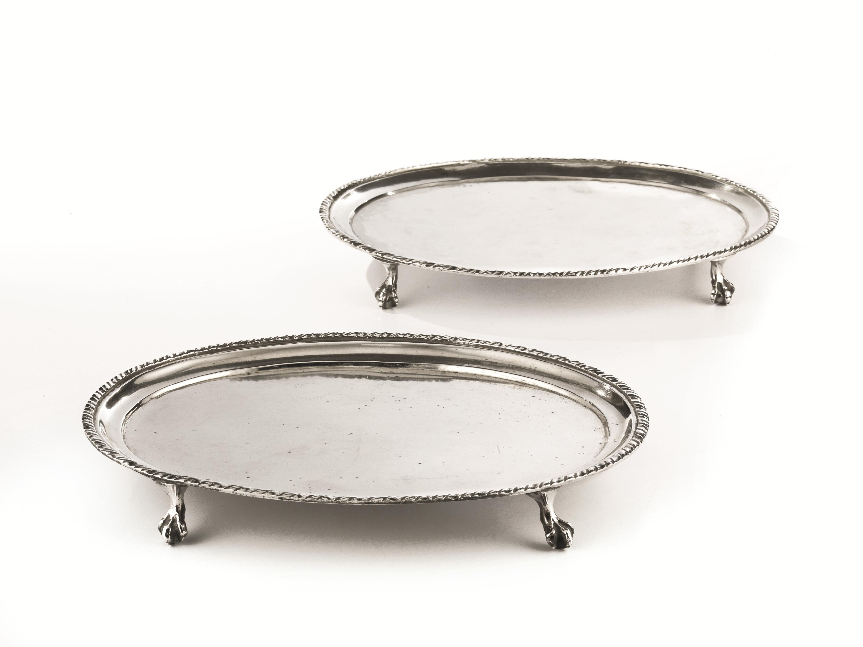 Vassoio ovale, Venezia, sec. XIX, in argento bordo a cordonetto, quattro piedini ad artiglio, cm 30x23, g 590 ed altro vassoio, Bologna, sec. XIX, di forma ovale in argento con bordo a cordonetto e quattro piedini ad artiglio, cm 30x23, g 650 (2)