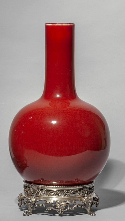 Vaso in porcellana sangue di bue a collo lungo marcato alla base Cina sec.XIX poggiante su base in argento f.ta Careilhac
