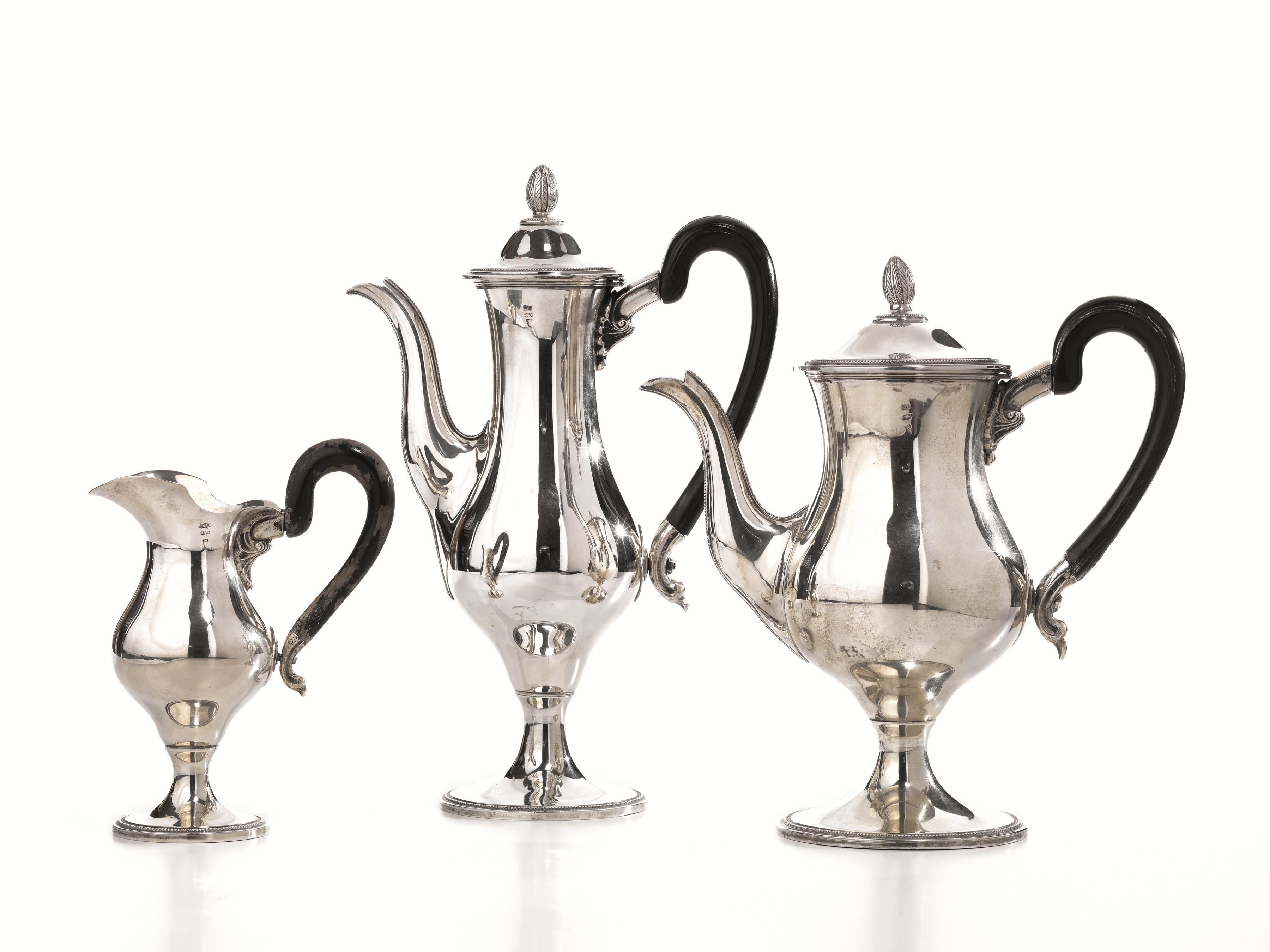 Caffettiera, cioccolatiera e zuccheriera, sec. XX, in argento, corpo piriforme su basi circolari decorate da perlinatura, manici in legno ebanizzato, finale dei coperchi a pigna, g 1800 (3)