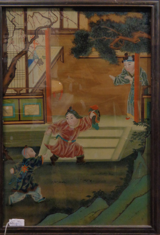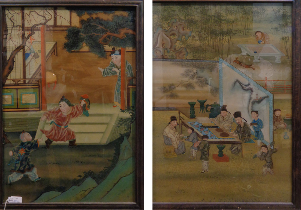 Coppia di dipinti su vetro raffiguranti scene di vita cinese Cina sec.XIX