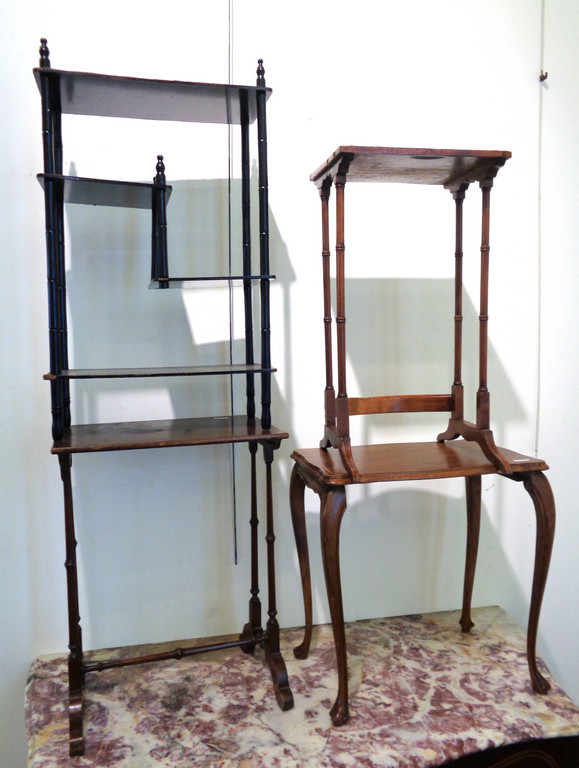 Tre tavolini in legno di forme diverse e piccola etagere in legno laccato