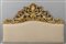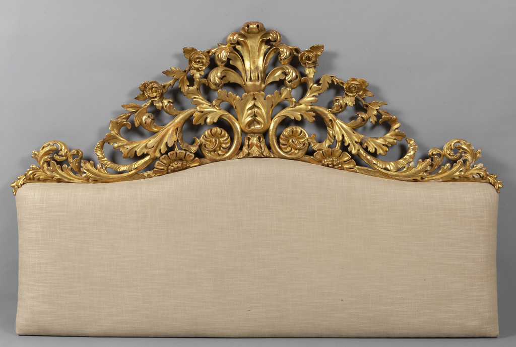 Testata da letto formata da un grande fregio in legno intagliato e dorato foderato con stoffa chiara sec.XVIII