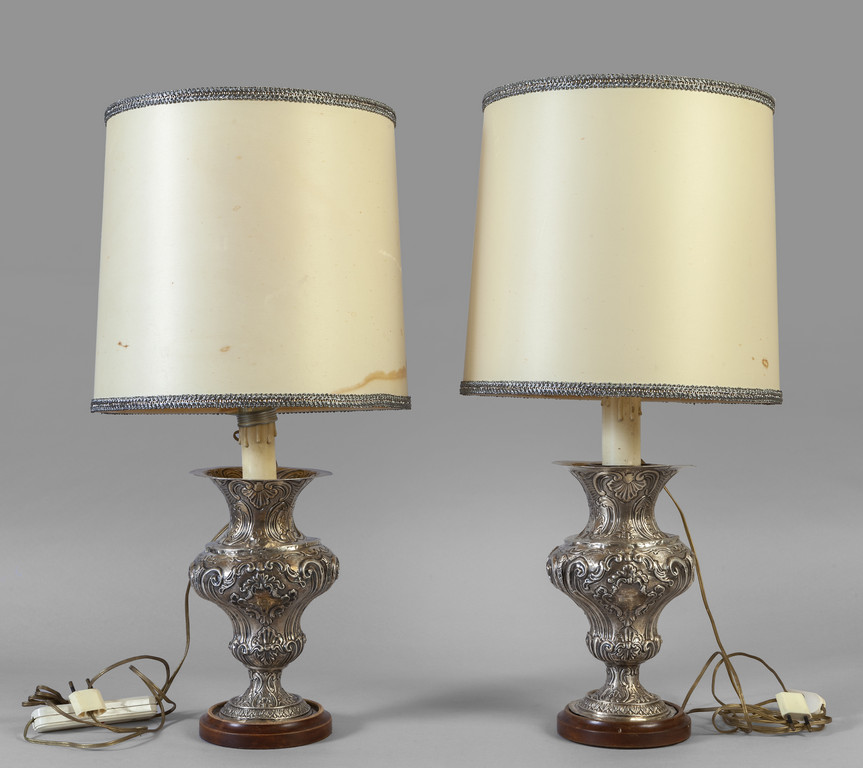 Coppia di vasi Luigi XIV in argento finemente sbalzato montati a lampada sec.XVII