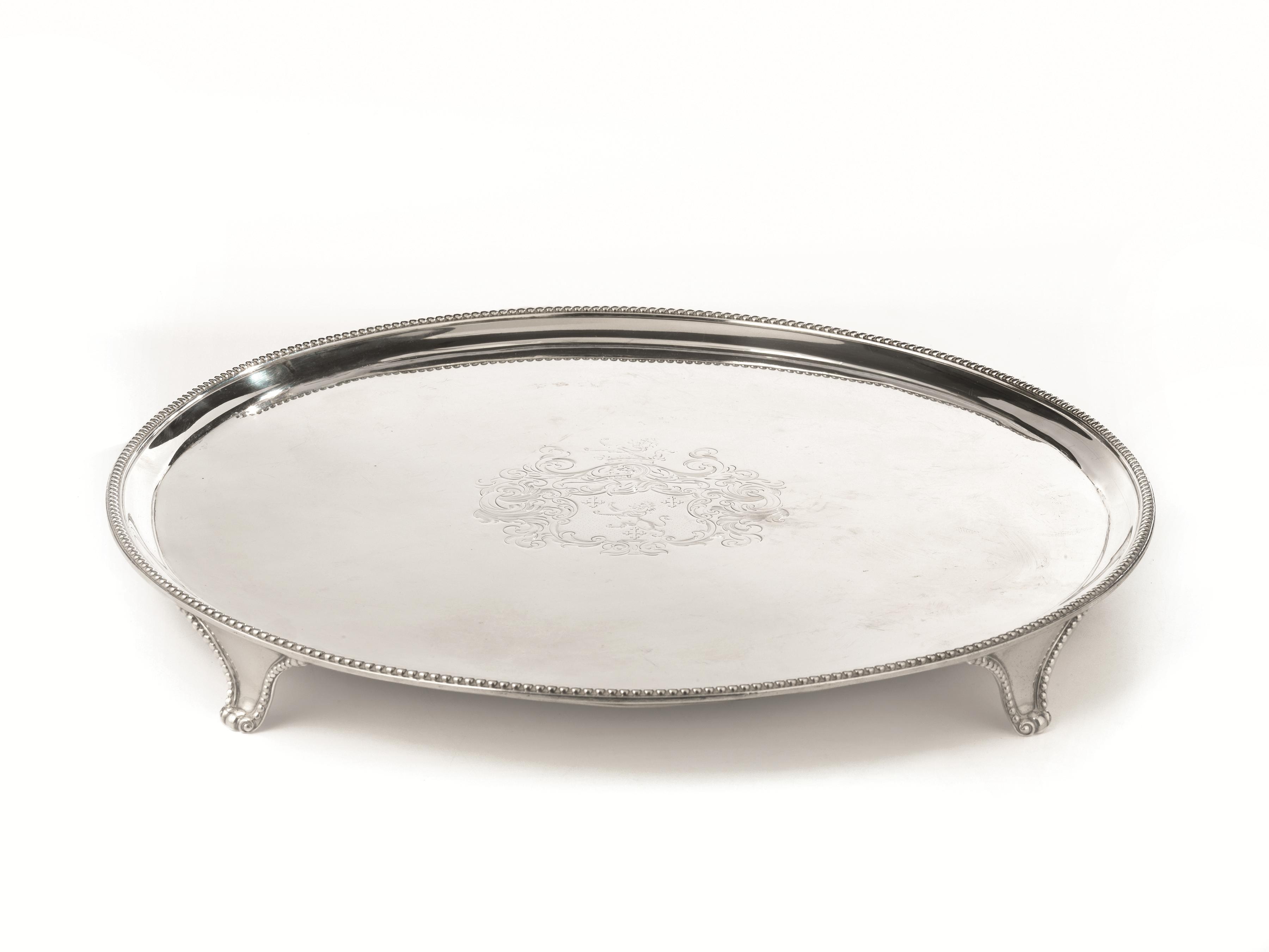 Salver, Londra, 1788, in argento, piano inciso con leone entro riserve fogliacee, bordo perlinato, diam. cm 40,5, g 1670