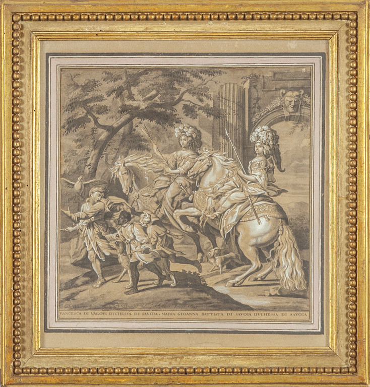 Georges Tasniere su disegno di Giovanni Battista Brambilla 'Francesca di Valois duchessa di Savoia e Giovanna Battista di Savoia Nemours' stampa sec.XVIII