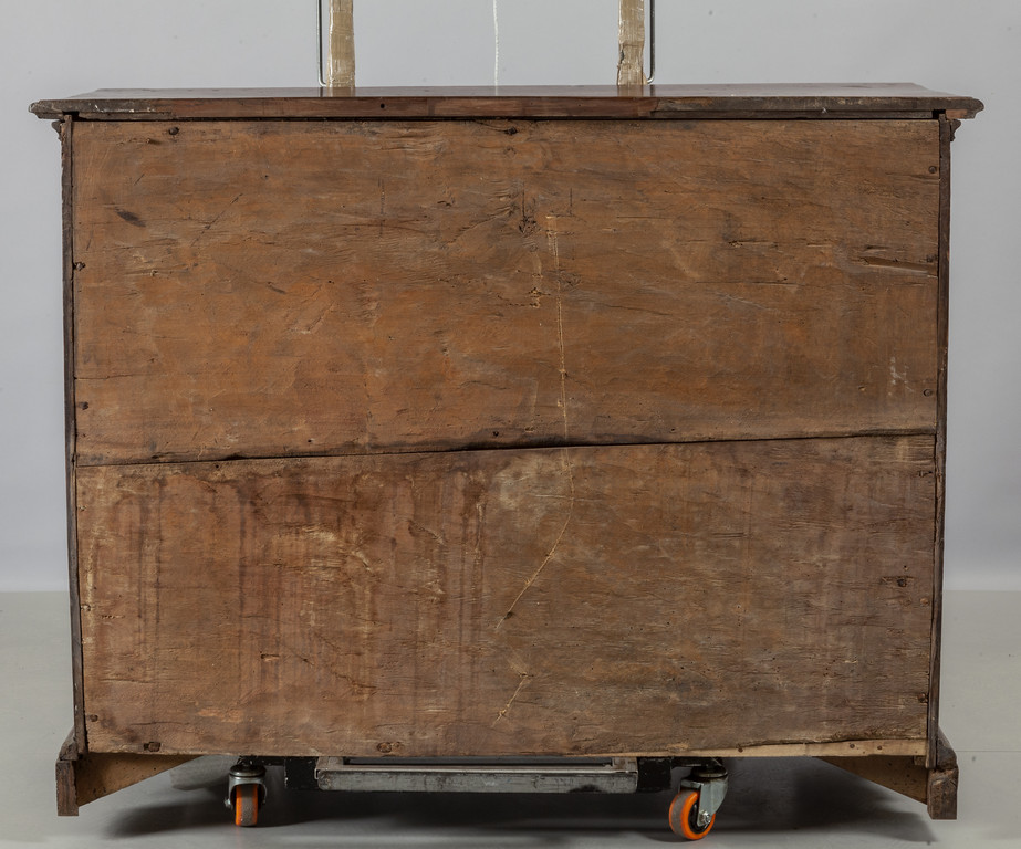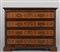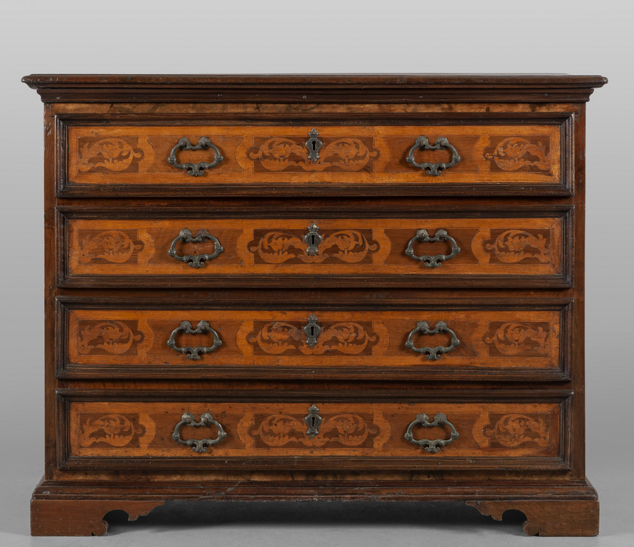 Canterano Luigi XIV a quattro cassetti lastronato ed intarsiato a motivi geometrici Piemonte sec.XVIII