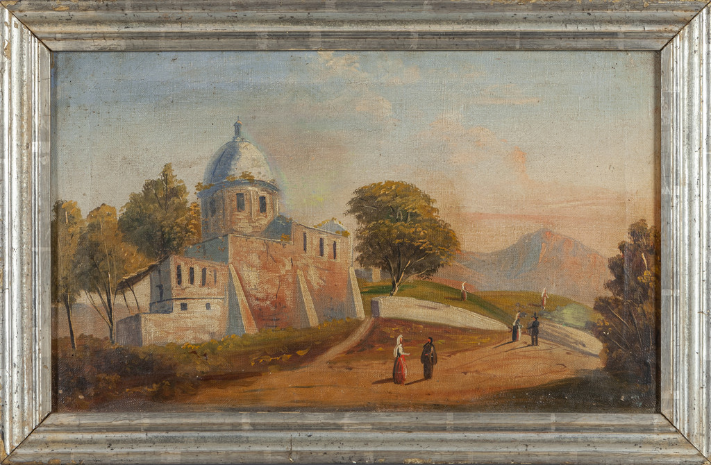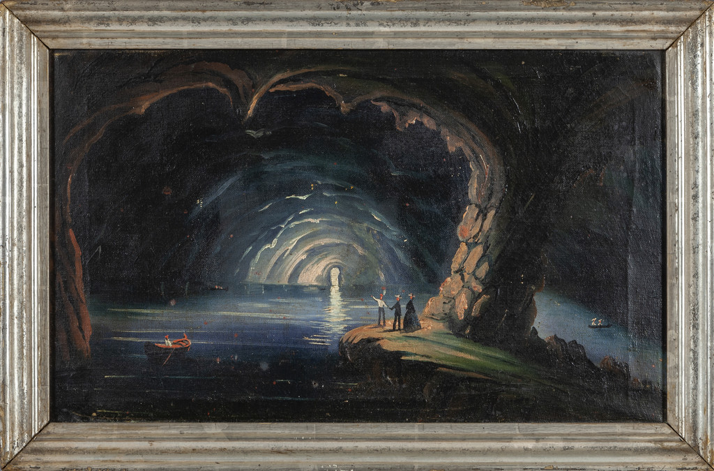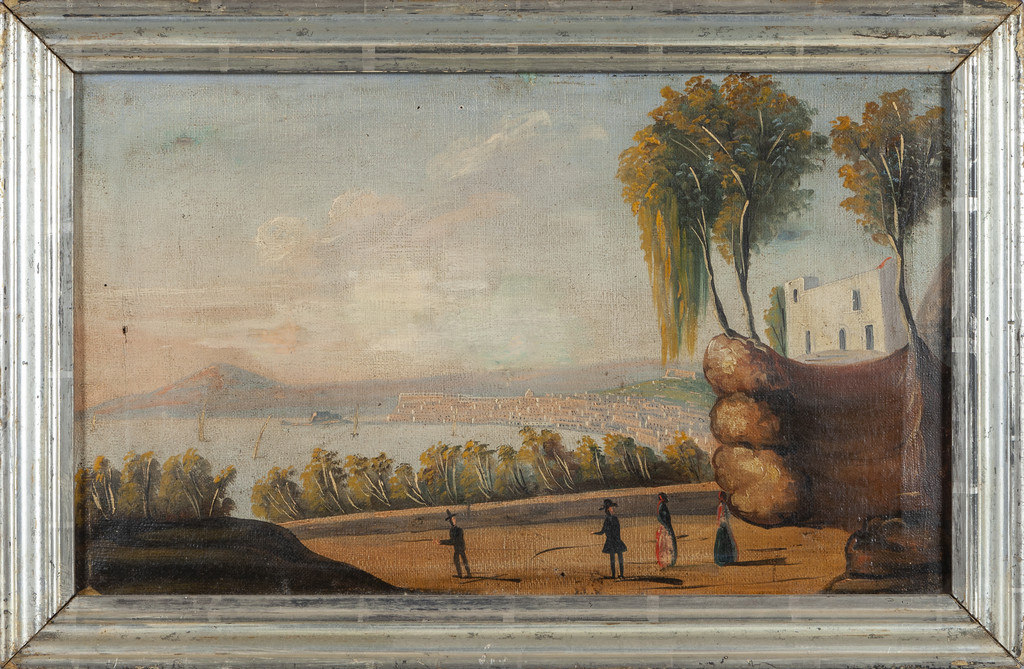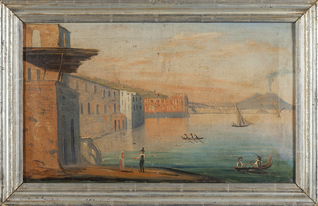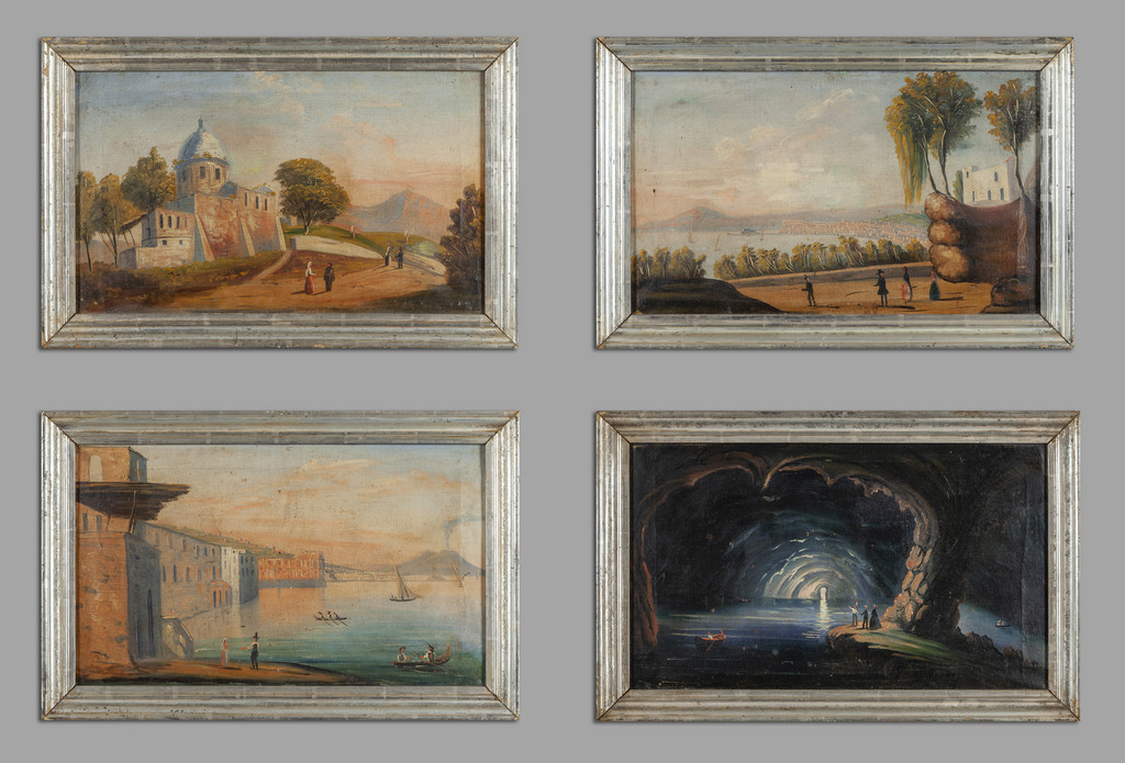 Scuola napoletana inizi sec.XIX 'Vedute di Napoli con il Vesuvio e la Grotta Azzurra' tre olii più uno