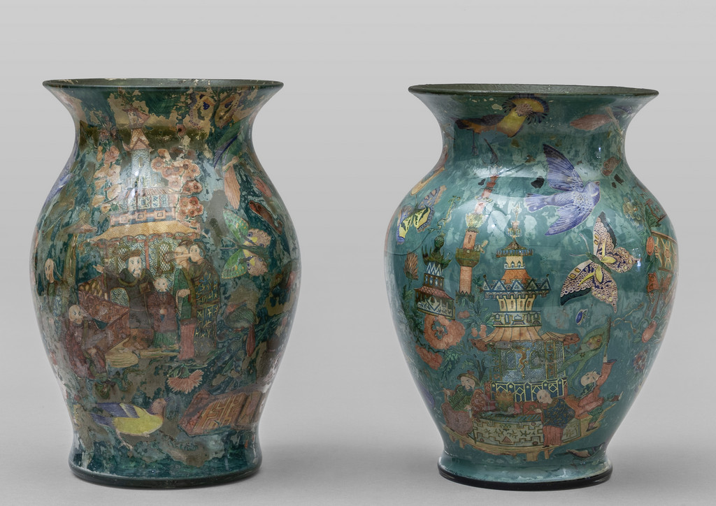 Due vasi in vetro dipinto con scene di vita orientale Piemonte sec.XVIII (uno filato)