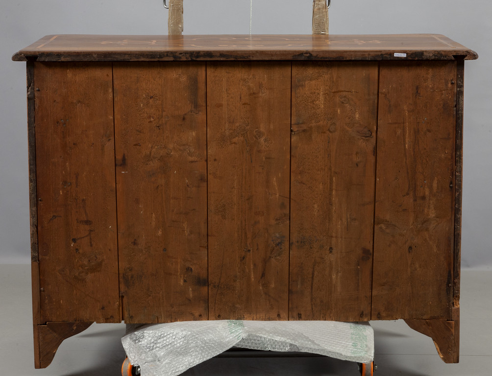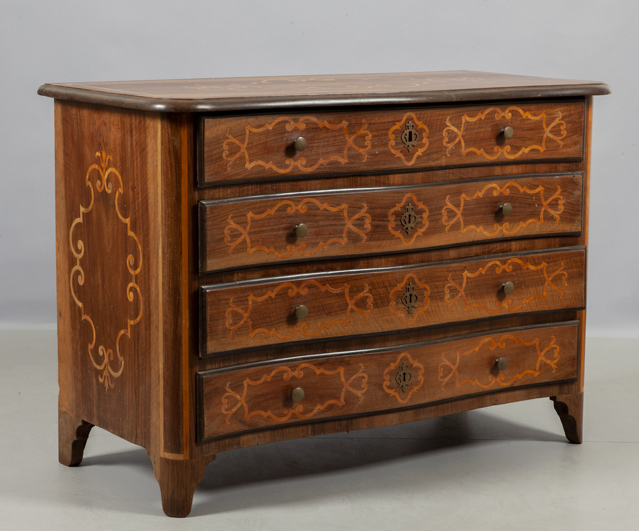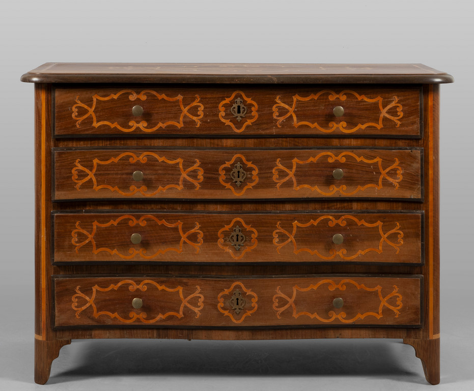 Comò Luigi XIV in noce intarsiato in bois de rose movimentato sul fronte quattro cassetti Piemonte sec.XVIII