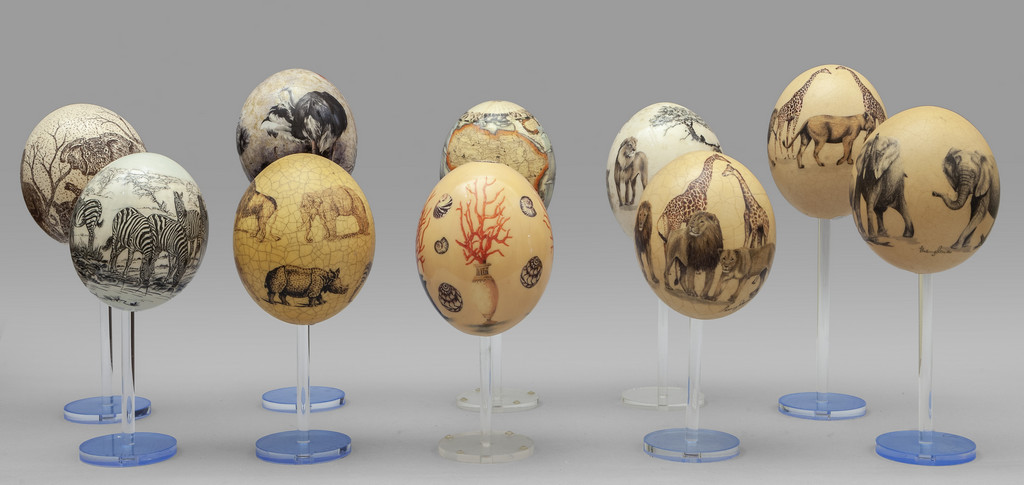 Collezione di 10 uova di struzzo dipinte a soggetti 'animalier' montate su basi in plexiglass