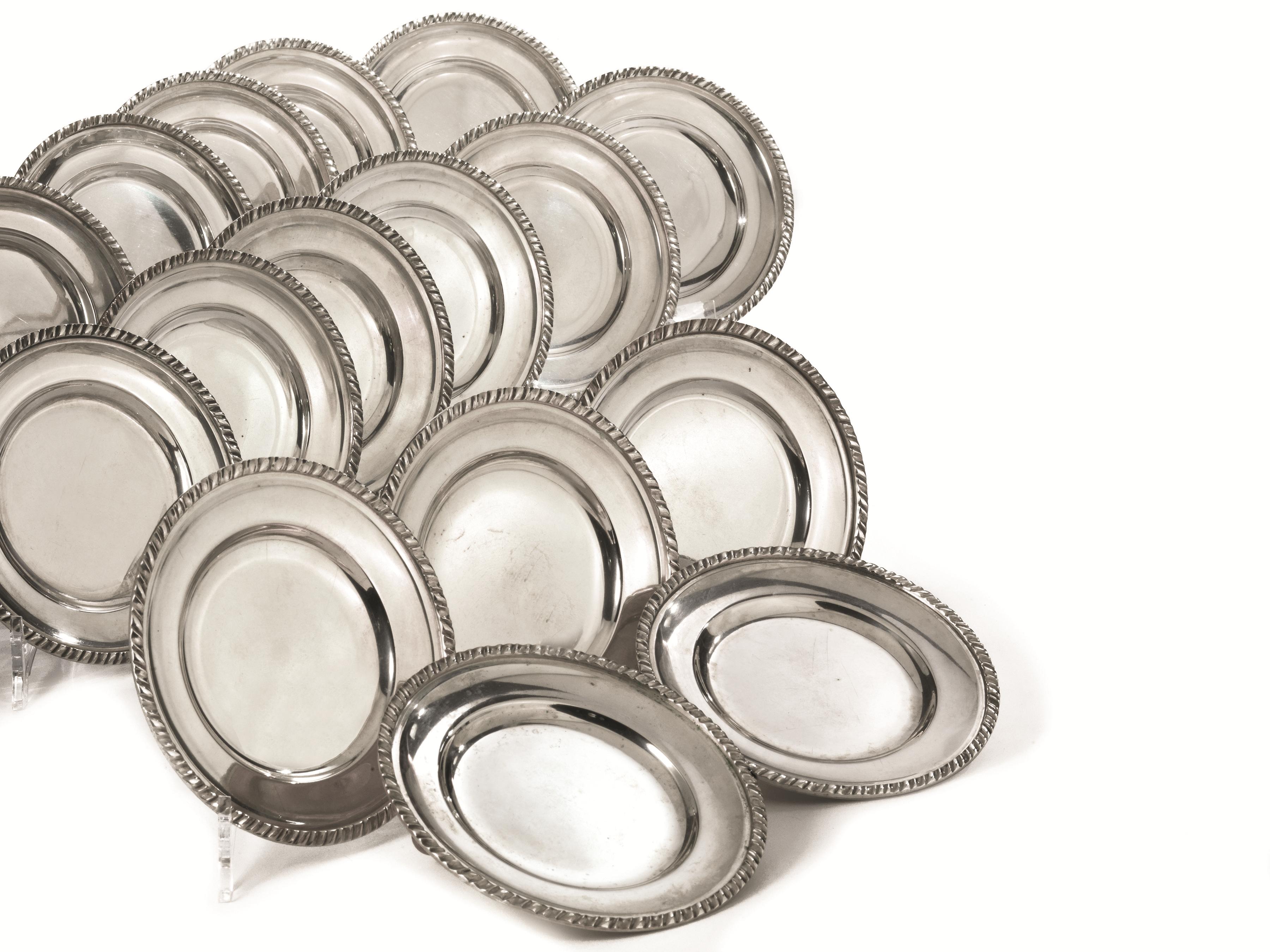 Sedici piattini da pane, in argento con bordo a cordonetto, diam. cm 16, g...