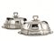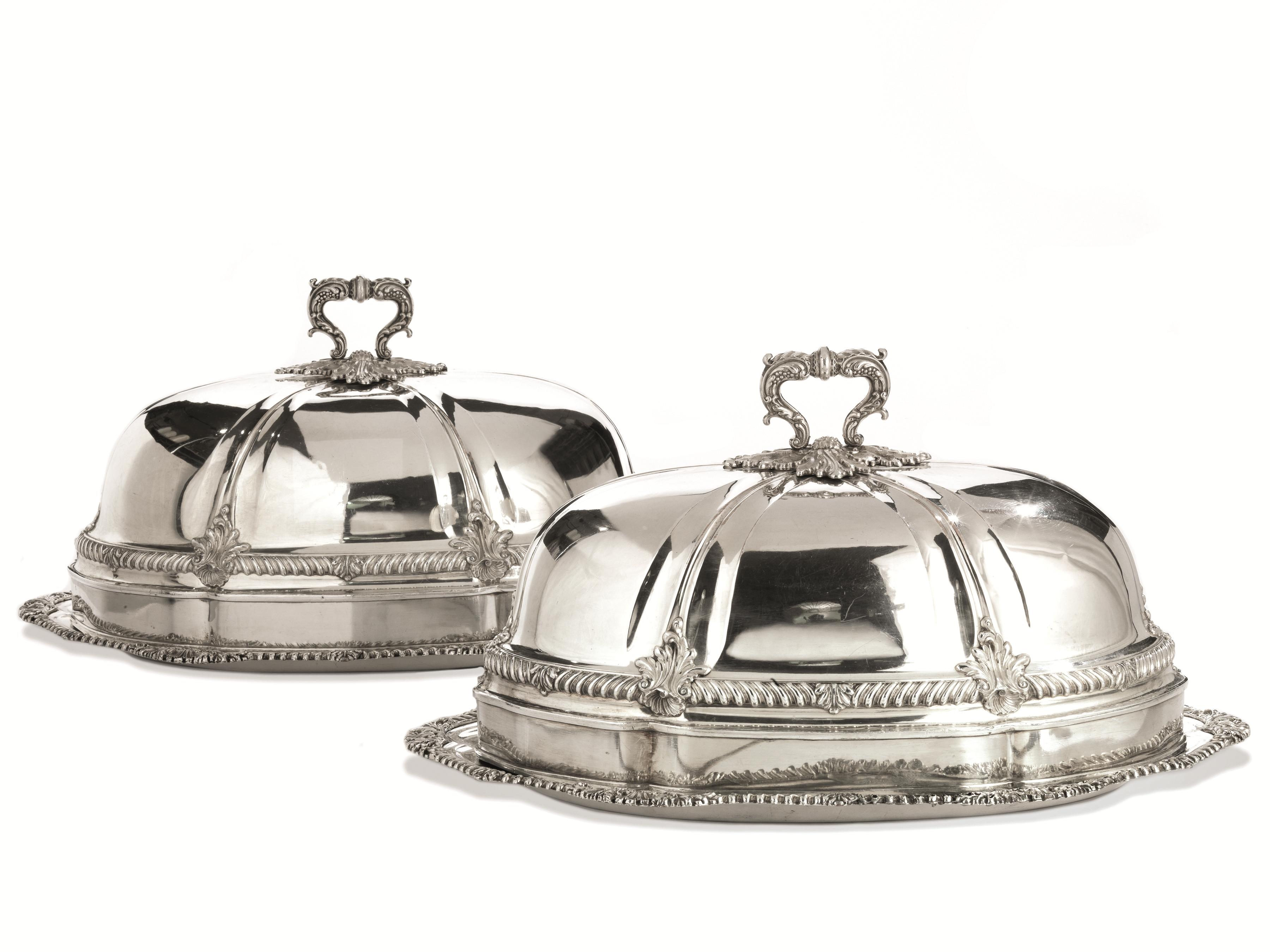 Coppia di grandi vassoi da arrosto, Inghilterra, sec. XIX, di forma ovale, in rame argentato, bordi a cordonetto intercalati da foglie cesellate, coperchi bombato e presa sagomata, cm 58x40, un vassoio con evidente restauro con stagno (2)