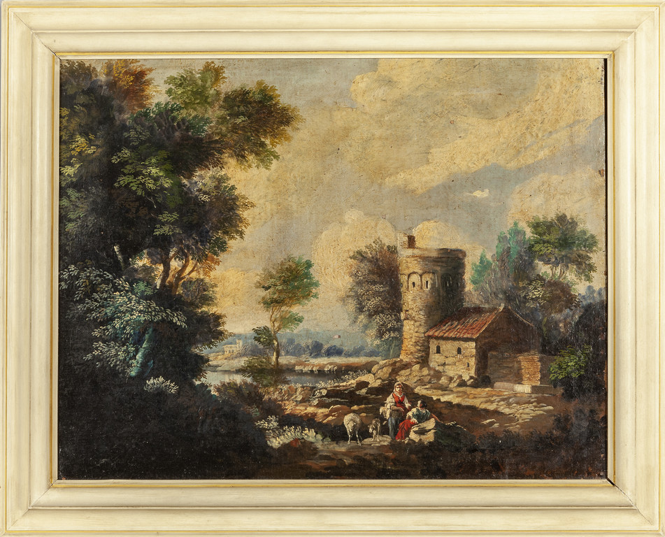 Scuola italiana 'Paesaggio animato con figure e torre' olio