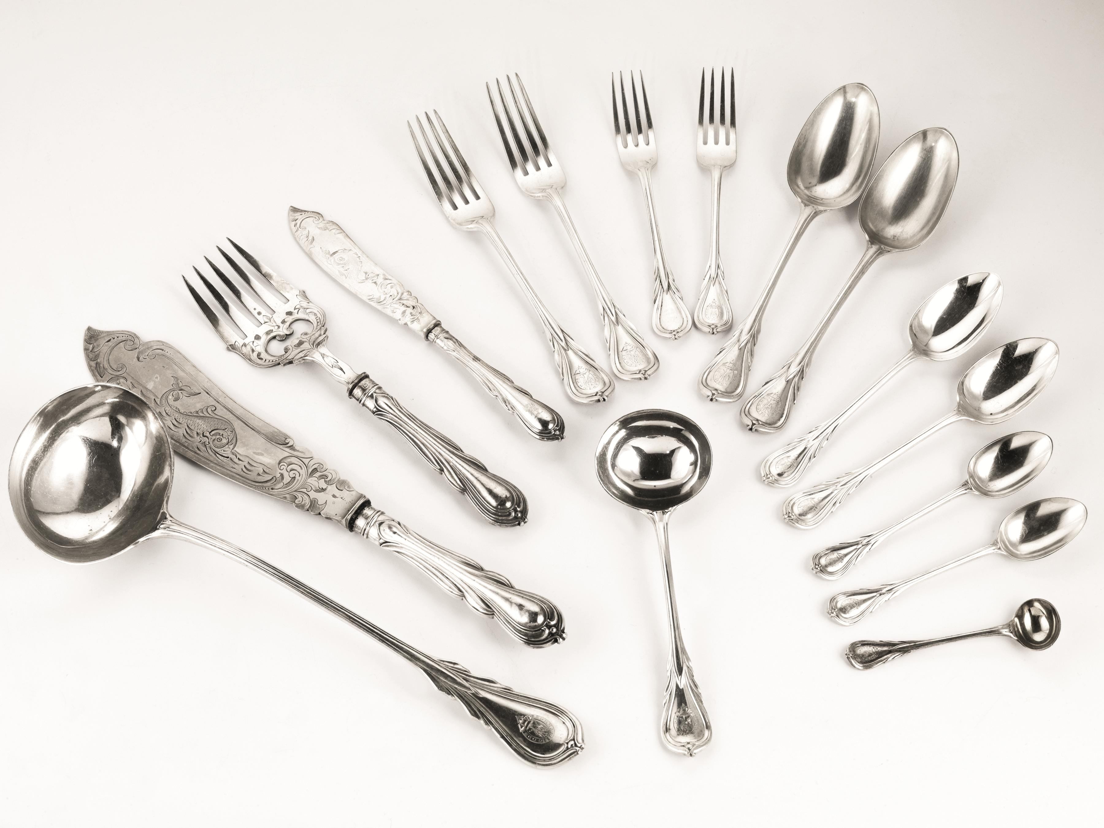 Composizione: 18 coltelli grandi; 18 coltelli da frutta; 1 coltellone; 1 forchettone ed 1 affila coltelli con manici in avorio e lame in ferro, danneggiati; 18 forchette da frutta; 18 cucchiai da dessert; 18 cucchiaini da tè; 18 coltelli da pesce; 18 cucchiai; 18 forchette; 2 cucchiaioni; 1 ramaioli e 9 posate da portata