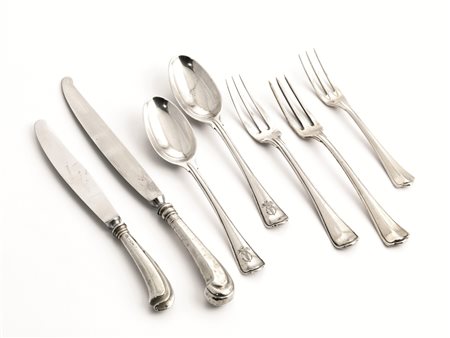 Servito di posate, modello san Marco, in argento composto di centotrentaquattro pezzi. Alcune posate sono del sec. XIX e recano stemma nobiliare inciso, peso dell'argento senza coltelli g 3450, peso del servito g 7350 lordi comprensivo di coltelli con manici in argento e parti metalliche.
