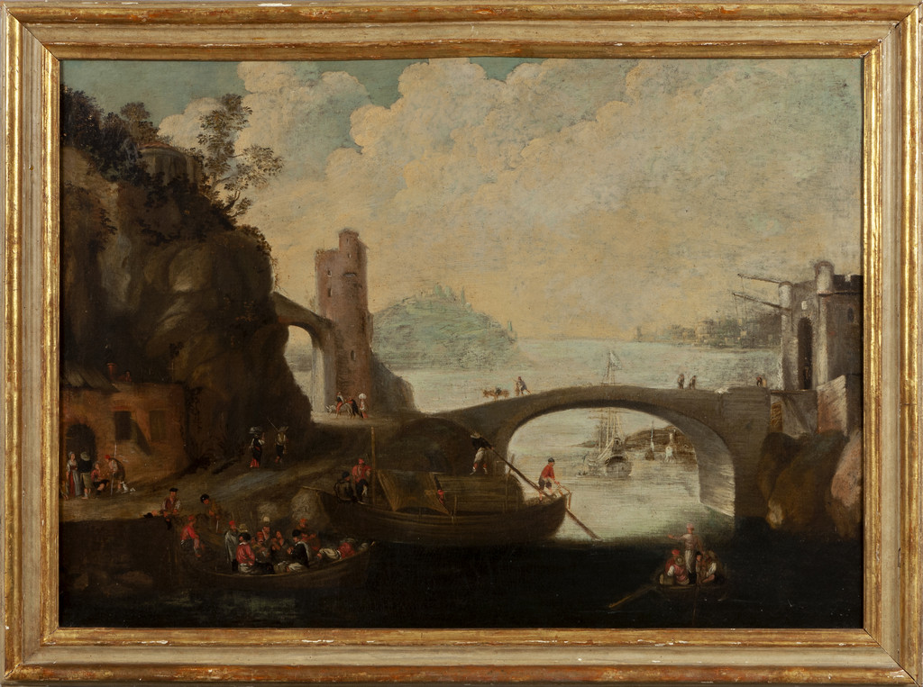 Scuola fiamminga sec.XVIII 'Paesaggio con ponte architetture e personaggi' olio