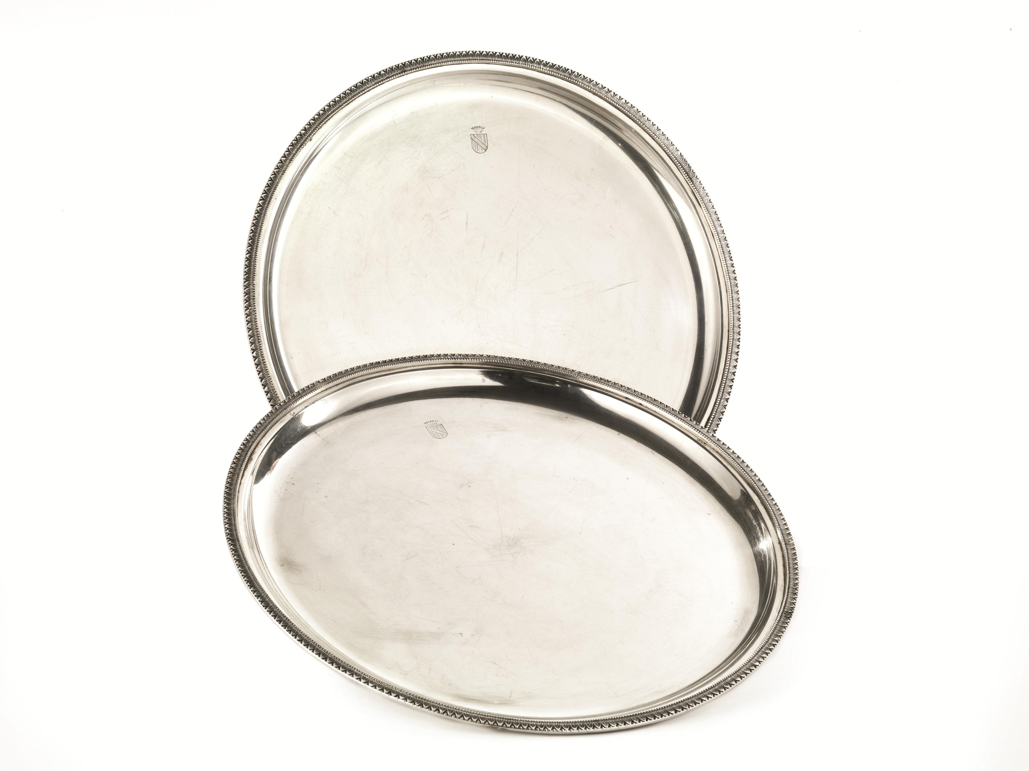 Quattro vassoi, in argento, due dei quali ovali e due circolari con bordi incisi a piccole foglie lanceolate, piani incisi a stemma nobiliare, cm 52x32 e diam. cm 38, g 2500 (4)