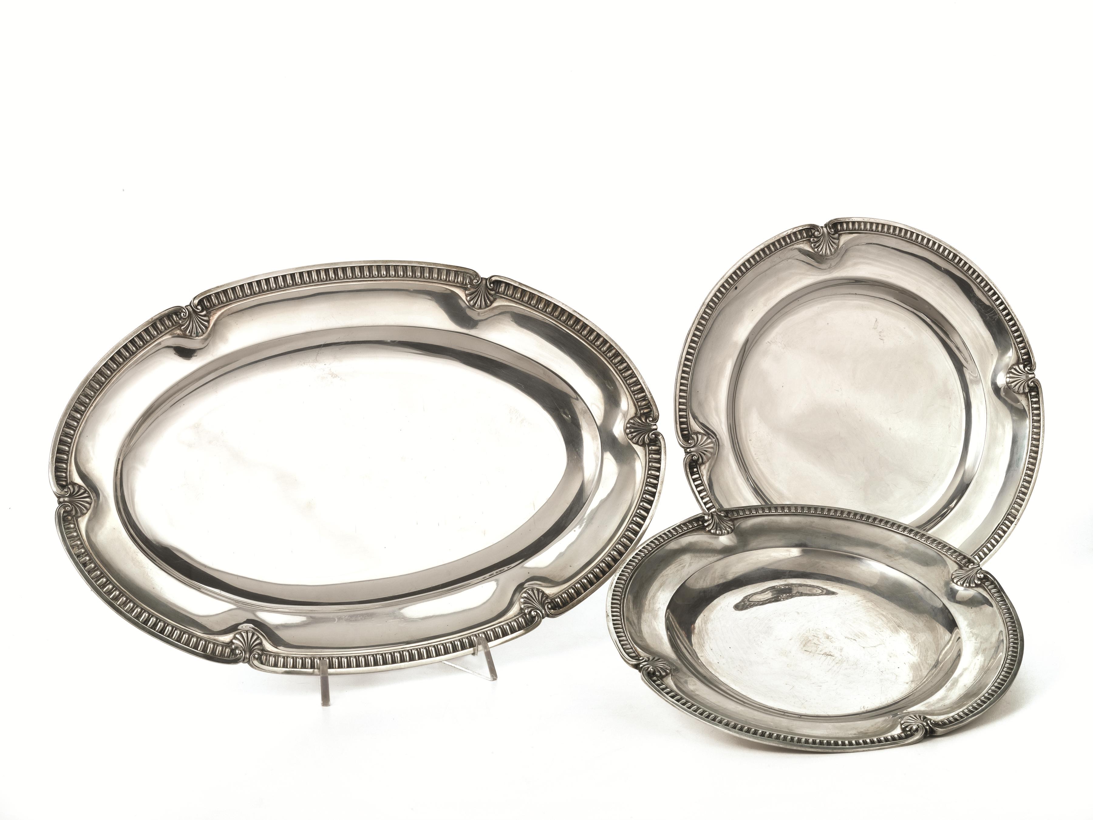 Coppia di vassoi, en suite col lotto precedente, in argento, di forma circolare con bordi lavorati a baccellature intercalate da motivi di conchiglie, diam. cm 25, g 900 ed un vassoio ovale en suite, cm 39,5x26, g 910 (3)