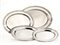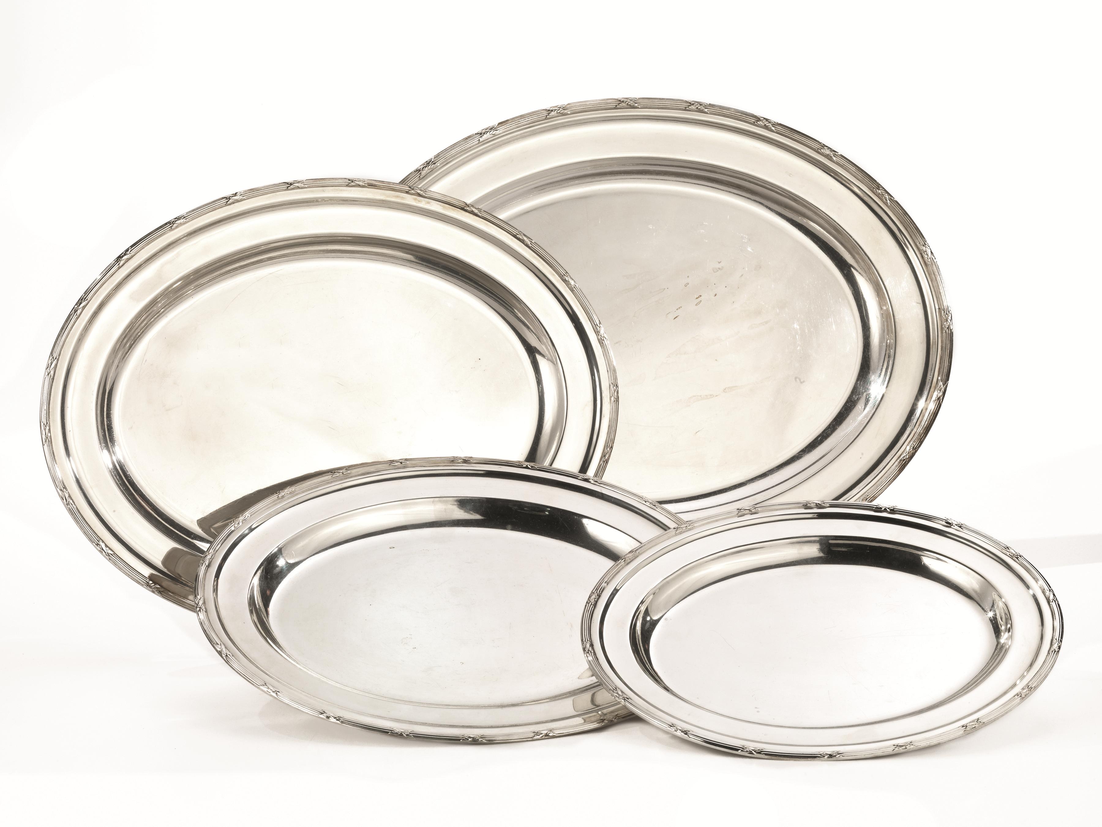 Quattro vassoi in gradazione, Inghilterra, Walker & Hall, in metallo argentato di forma ovale con bordi decorati da nastri, cm 46x35,5, cm 41x31, cm 35x27 e cm 30x23 (4)