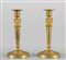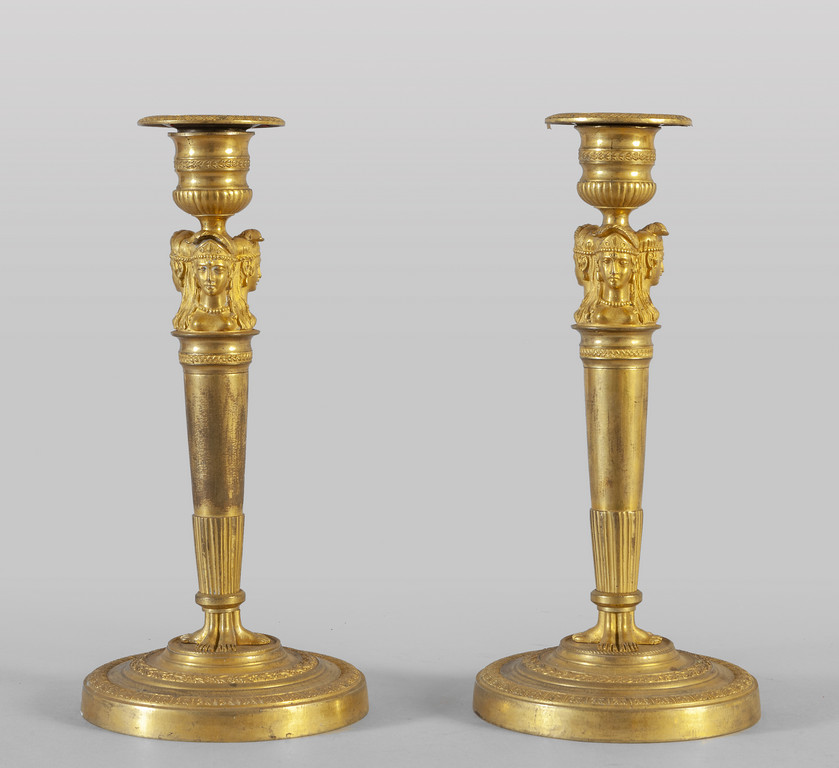 Coppia di candelieri in bronzo dorato fusto con tre testine sec.XX
