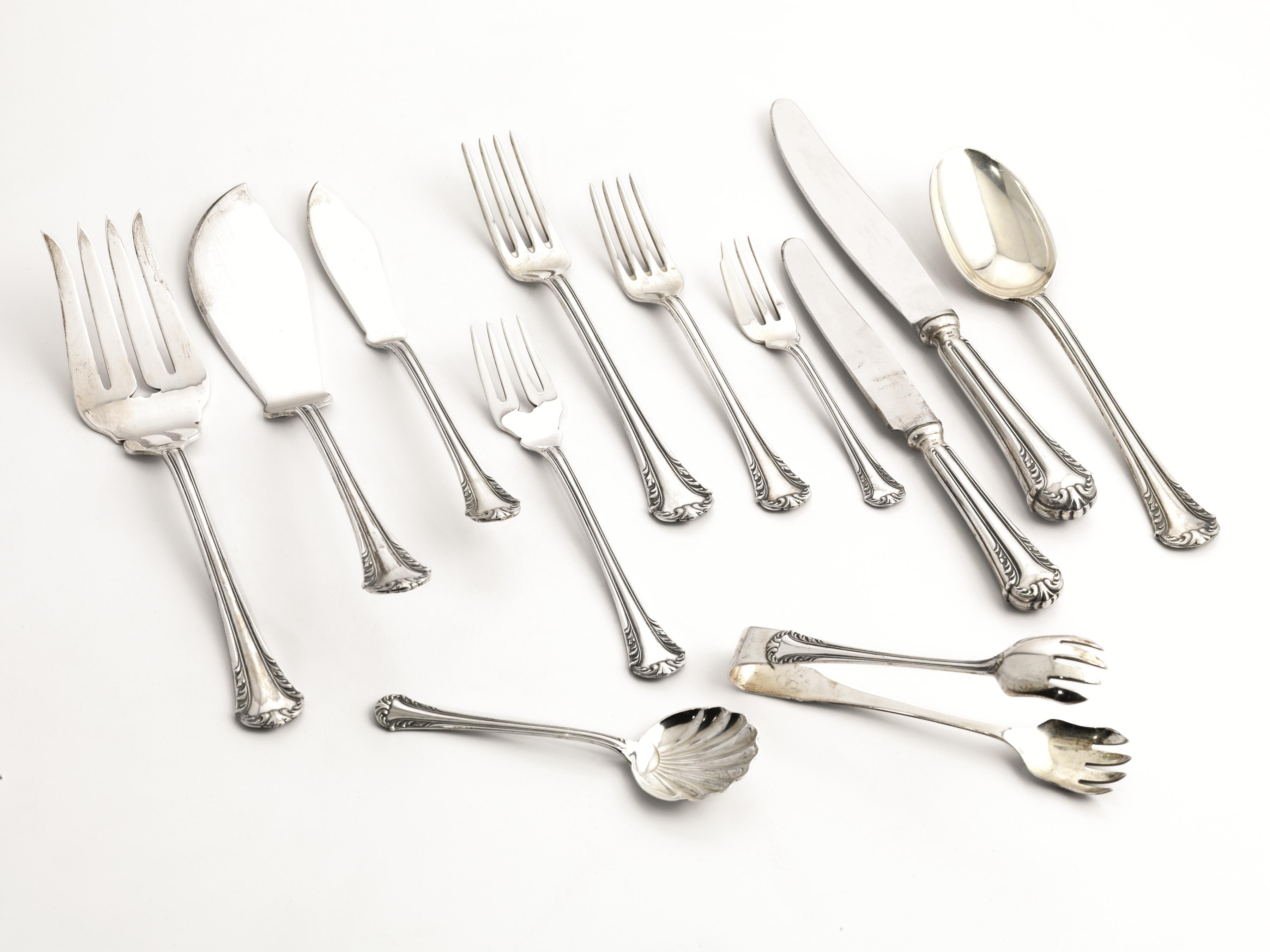 cucchiai e dodici forchette da dessert; 9 posate da portata; 1 pinza ed 1