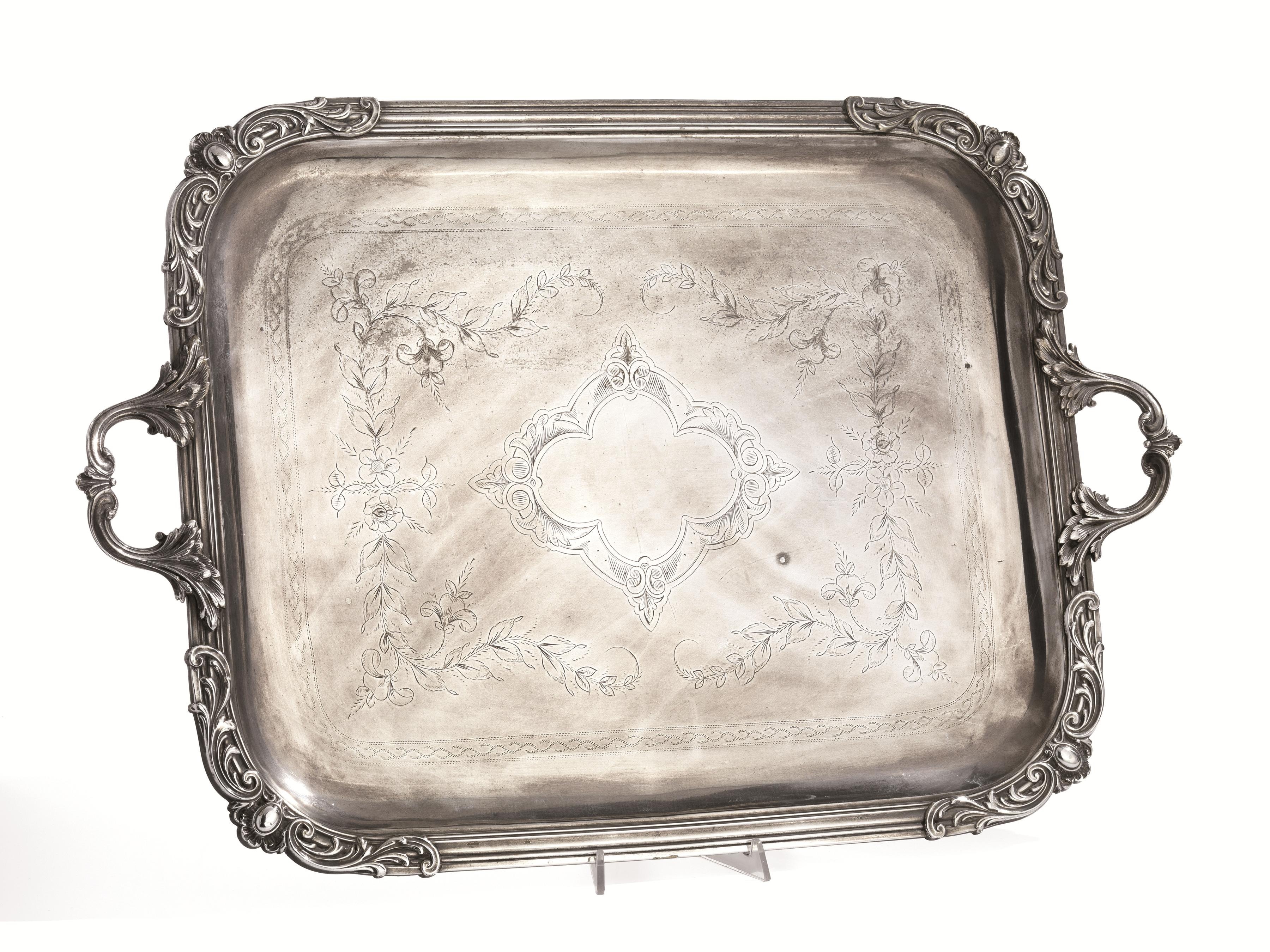 Guantiera, Inghilterra, secolo XX, in metallo argentato di forma rettangolare con bordo sbalzato a motivi vegetali, anse modellate a foglie, cm 73,5x49