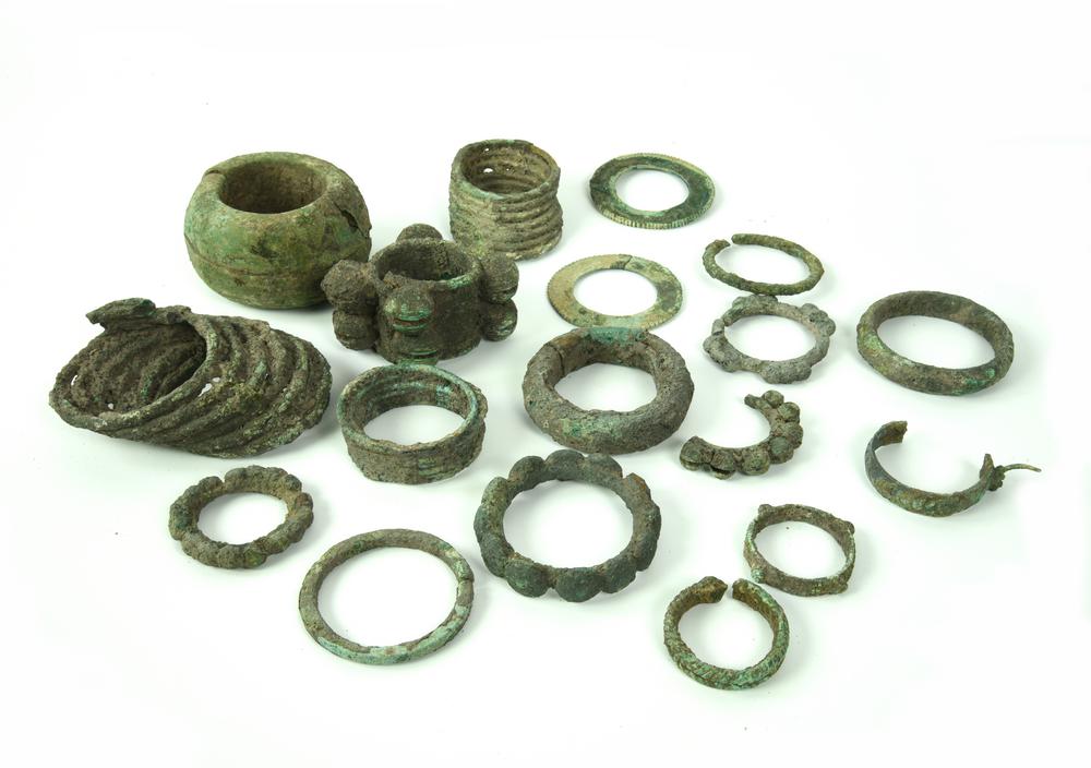 Diciotto fra braccialetti di varie forme in bronzo, fra i quali tre spiraliformi ad elementi sovrapposti (18)