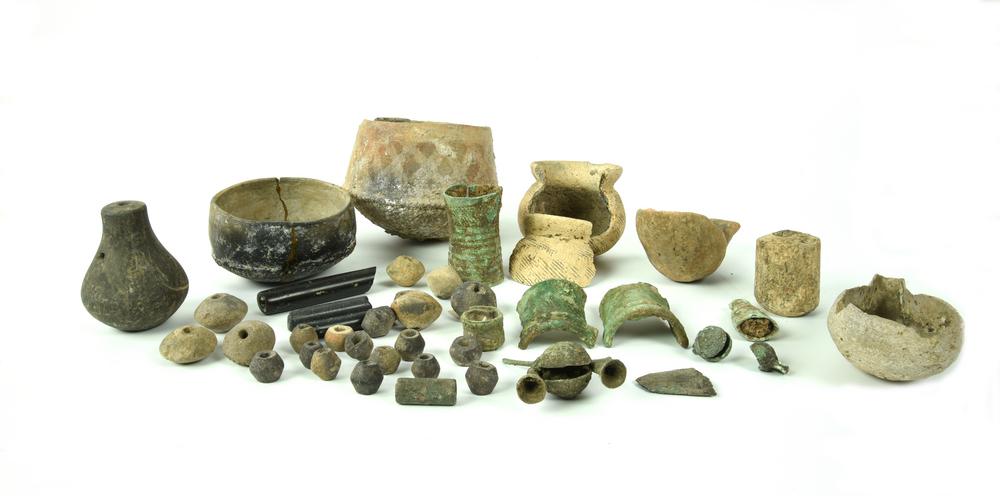Ventuno fuseruole in terracotta, tre cilindri levigati in pietra nera, due coppe e un vasetto in argilla bruna decorati ad incisione, due mestoli in terracotta, cinque sonagli in bronzo, due parti di impugnatura in bronzo cesellato, un frammento cilindrico in terracotta, un oggetto piriforme in pietra scura, un vago cilindrico di collana e due frammenti di bronzo
