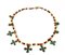 Collana con vaghi in pasta vitrea nera bianca e rossa e pendenti a bulla e a croce greca in bronzo fuso