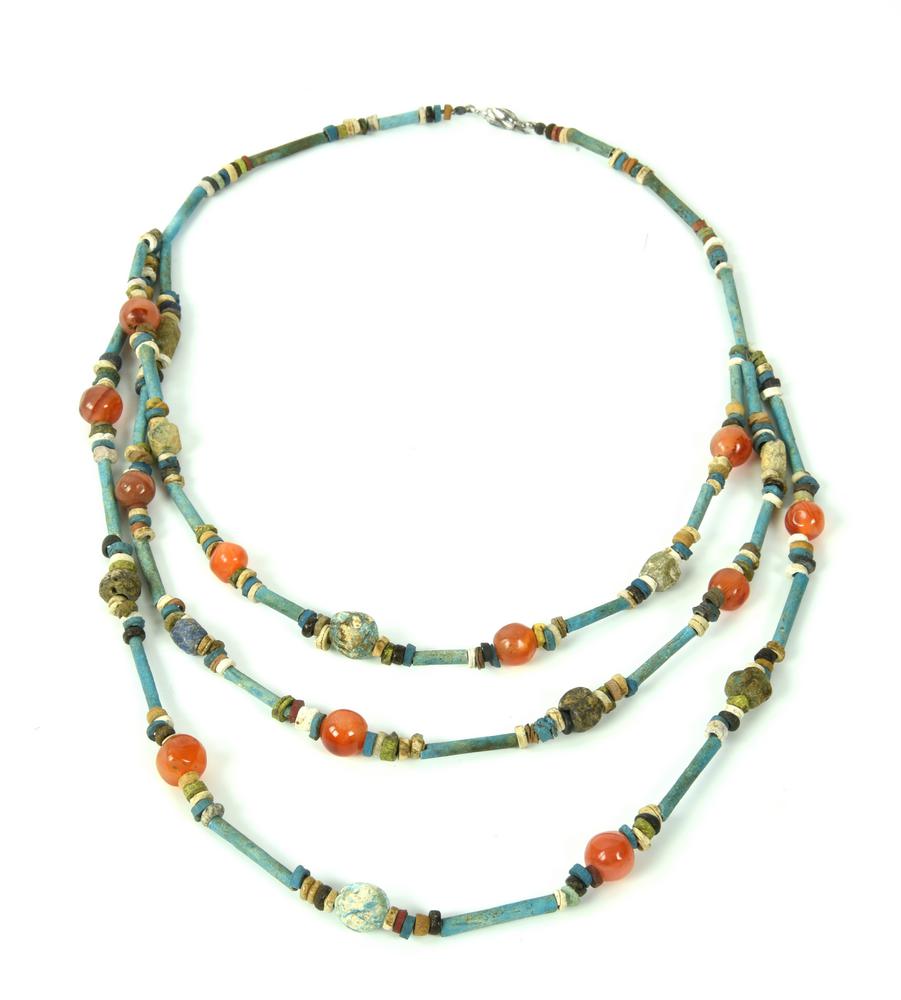 Collana a tre fili con tubuli in faience azzurra, vaghi in corniola e pasta vitrea