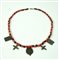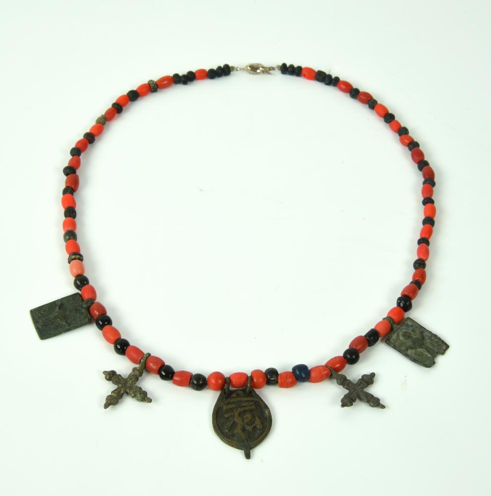 Collana con vaghi in pasta vitrea nera e rossa e pendenti a croce greca e placchette con immagini sacre in bronzo fuso