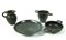Piccola kylix a vasca troncoconica, basso piede troncoconico, anse a bastoncello impostate orizzontalmente sotto l'orlo; uno skyphos con orlo leggermente estroflesso, corpo troncoconico, piede ad anello, anse a nastro impostate orizzontalmente sotto l'orlo; brocchetta con orlo a tesa, collo cilindrico, corpo ovoide baccellato, fondo piatto, ansa a doppio bastoncello, impostata sull'orlo e la spalla, piattello con labbro arrotondato, vasca e piede troncoconici (4)