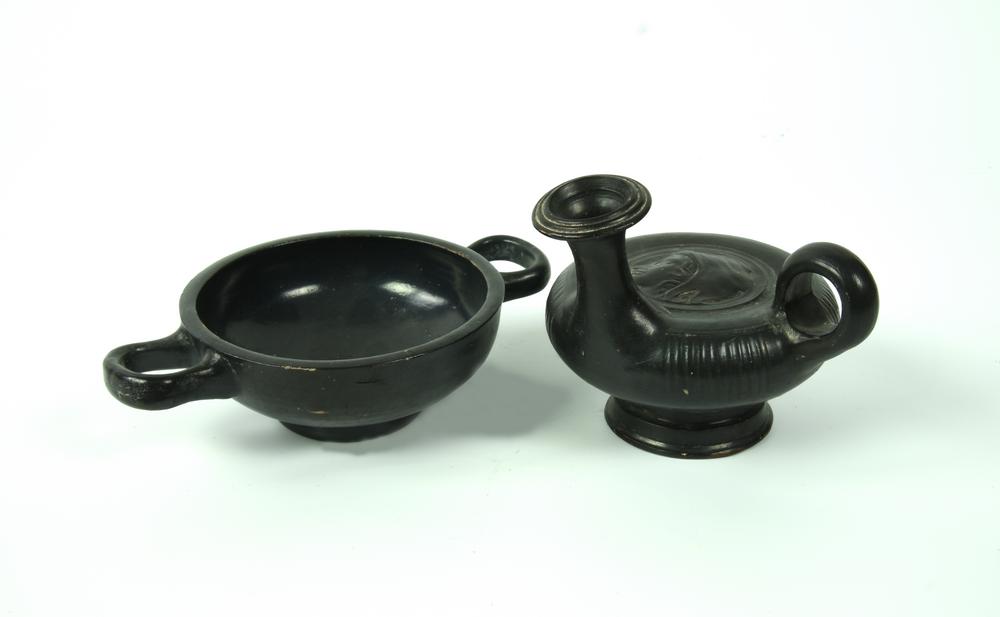 Guttus con corpo lenticolare strigilato e alto piede modanato; decorato al centro del disco da bel profilo maschile volto a destra con cappuccio su i capelli; ansa ad anello impostata obliquamente sulla spalla ed alto beccuccio con labbro scanalato; piccola kylix a vasca troncoconica, basso piede troncoconico, anse a bastoncello impostate orizzontalmente sotto l'orlo (2)