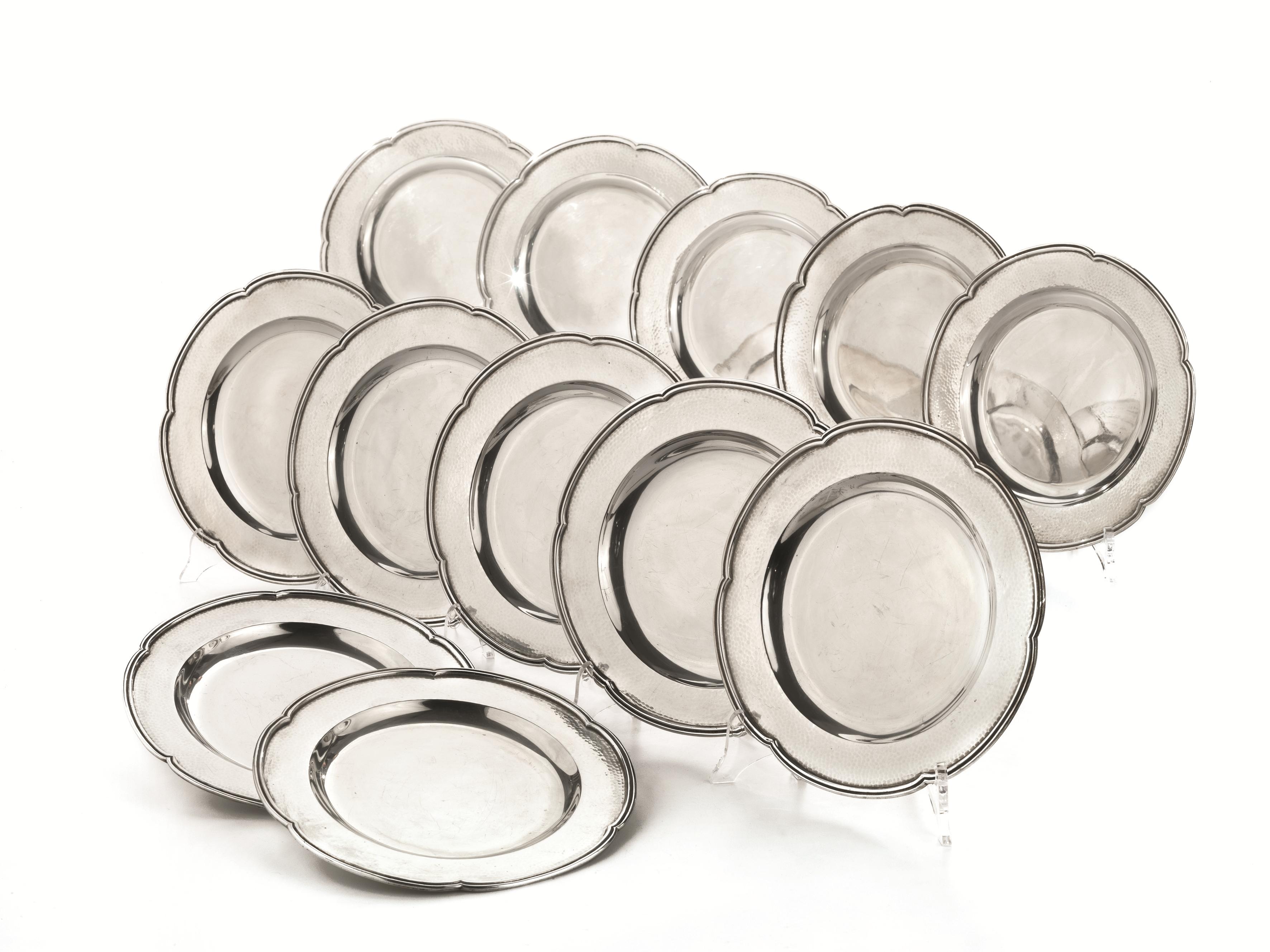 Dodici piattini, in argento, bordo smerlato e tesa martellata, diam. cm 20,