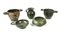 Skyphos con vasca troncoconica, piede ad anello ed anse a bastoncello orizzontali, decorato a vernice rossa con meandro ad onda e meandro interrotto sopra una fascia con tralcio d'olivo orizzontale; skyphos con orlo leggermente estroflesso, corpo troncoconico, piede ad anello, anse a nastro impostate orizzontalmente sotto l'orlo; brocchetta con orlo a tesa, collo cilindrico, corpo ovoide, fondo piatto, ansa a nastro, impostata sull'orlo e la spalla, coppetta con orlo spiovente obliquo e piede troncoconico, coppetta monoansata con orlo leggermente rientrante e piede ad anello (5)