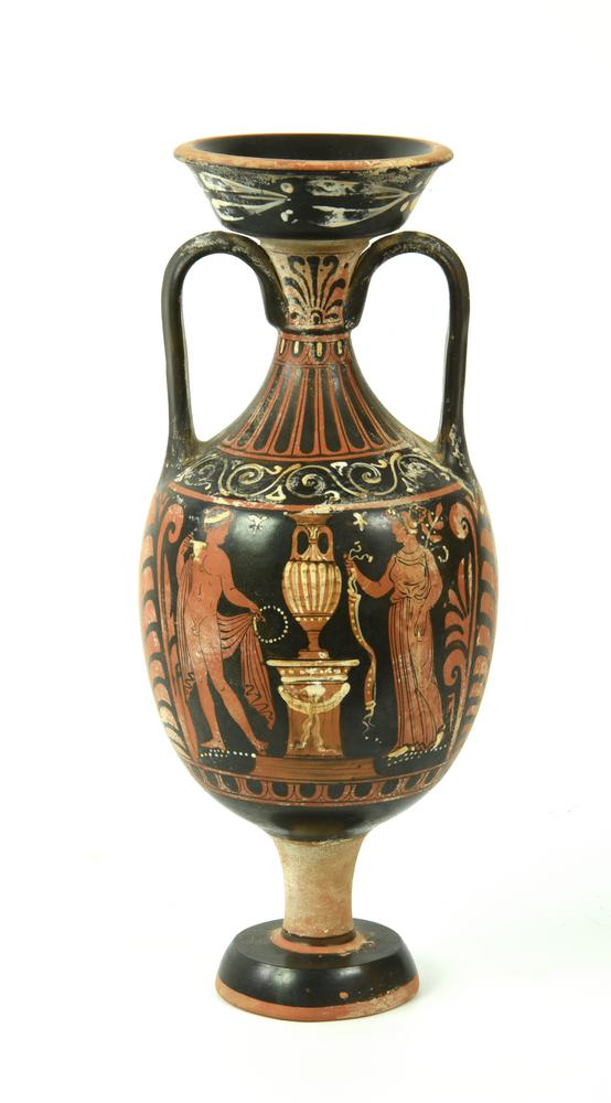 DECORAZIONE: lato A) un giovane uomo nudo, gradiente a destra e retrospiciente, con tenia nei capelli ed un himation drappeggiato sulla spalla destra e sostenuto dalla mano sinistra che regge anche una ghirlanda, è in atto di portarsi un kantharos alla bocca, dall'altro lato una giovane donna stante e volta a destra, riccamente abbigliata con kekryphalos, stephane radiata, armille e calzari indossa un chitone plissettato e tiene una lunga benda ricamata nella destra ed un tirso nella sinistra; fra le due figure un'ara dipinta ed adorna di nastri sulla quale è posta una monumentale anfora baccellata; lato B) scena di conversazione in palestra fra due efebi affrontati, completamente avvolti nell'himation, drappeggiato in ampie pieghe dal quale fuoriescono solo la testa cinta da una tenia e i piedi calzati; fra i due una tavoletta scrittoria con lo stilo.