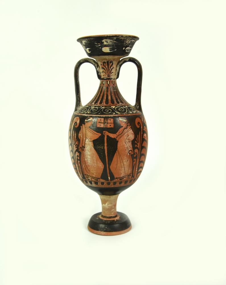 DECORAZIONE ACCESSORIA: sul labbro tralcio di olivo orizzontale, sul collo palmetta aperta a ventaglio, kyma ionico e linguette radiali; sulla spalla volute e girali vegetali; sotto le anse grandi palmette aperte a ventaglio fra girali; sotto la scena figurata falsa baccellatura; stelo e fondo del piede risparmiati