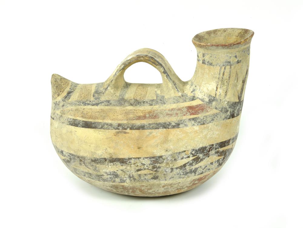 Askos con orlo lievemente svasato indistinto dal collo cilindrico, corpo globoso allungato, con estremità posteriore appuntita, fondo piatto; ansa a nastro impostata longitudinalmente sul dorso, decorato a fasce orizzontali e motivi diagonali