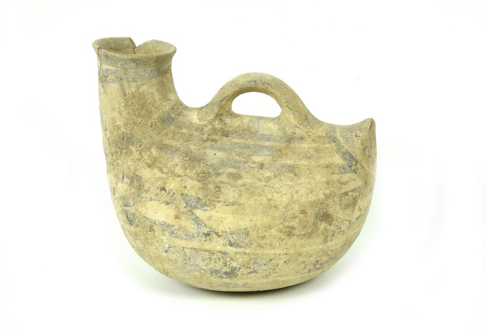 Askos con orlo lievemente svasato indistinto dal collo cilindrico, corpo globoso allungato, con estremità posteriore appuntita, fondo piatto; ansa a nastro impostata longitudinalmente sul dorso, decorato a fasce orizzontali e motivi a tremolo