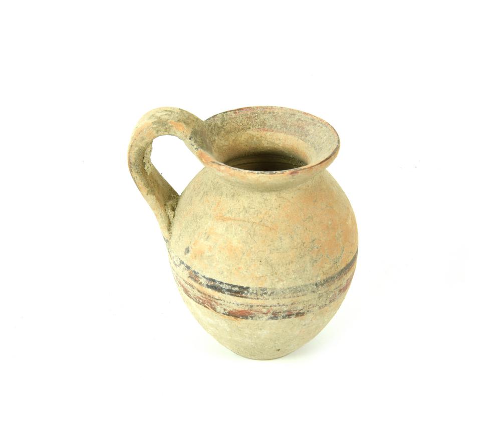 Brocchetta con orlo svasato, distinto dal corpo ovoide, fondo piatto, ansa a nastro impostata verticalmente sulla spalla; decorata a fasce e filetti