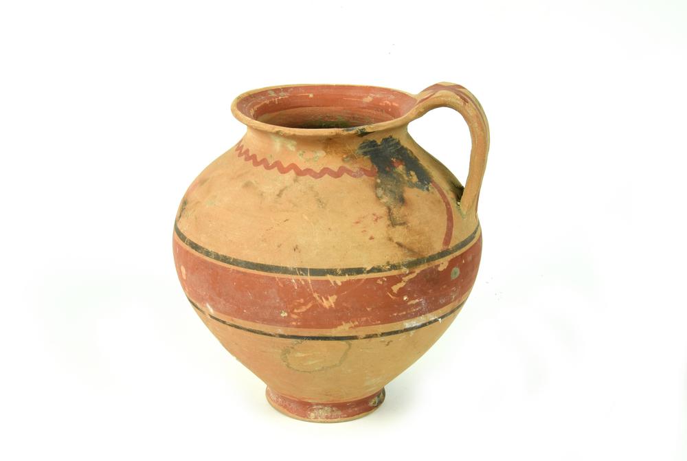 Brocca con orlo svasato, distinto dal corpo ovoide, piede a disco, ansa a nastro impostata verticalmente sulla spalla; decorata a fasce e filetti